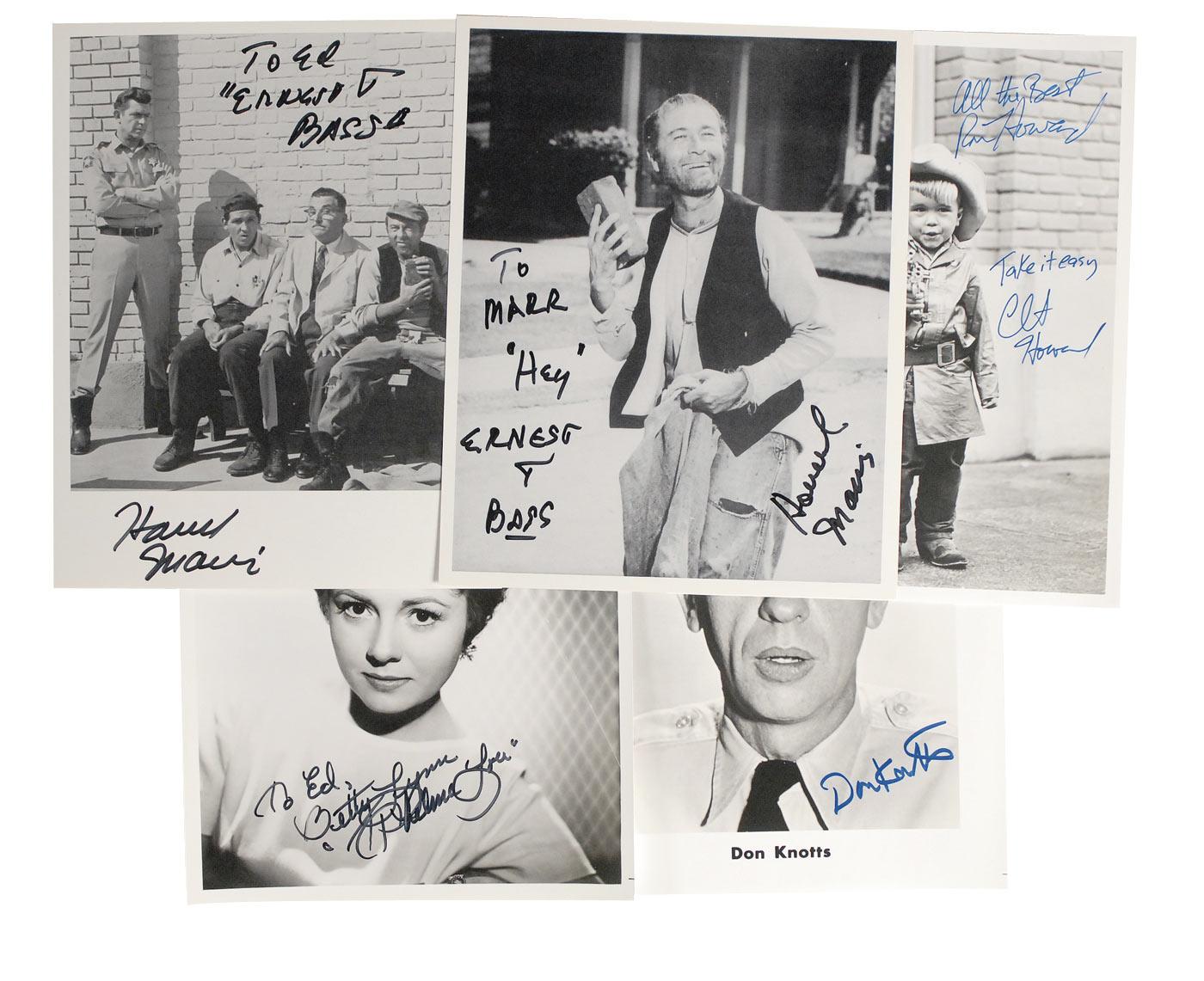 Five items: three glossy 8 x 10 photos and two cardstock 8 x 10 photos of Andy Griffith Show stars, each in character, signed in black or blue felt tip by the respective actor pictured: Don Knotts, Betty Lynn (ins), Ron Howard and Clint Howard, and two signed by Howard Morris (both ins). In overall fine condition.