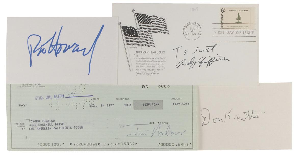 Four items: an FDC, with a cachet honoring the American flag, signed and inscribed in black ink by Andy Griffith; a personal check from 1977, filled out in type and signed by Jim Nabors, and ink and felt tip signatures of Ron Howard and Don Knotts on individual cards. In fine condition, with expected stamps and holes to check. Accompanied by an unsigned color glossy 11 x 14 cast photo.