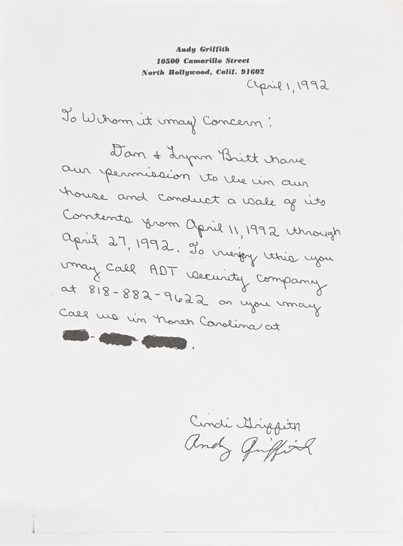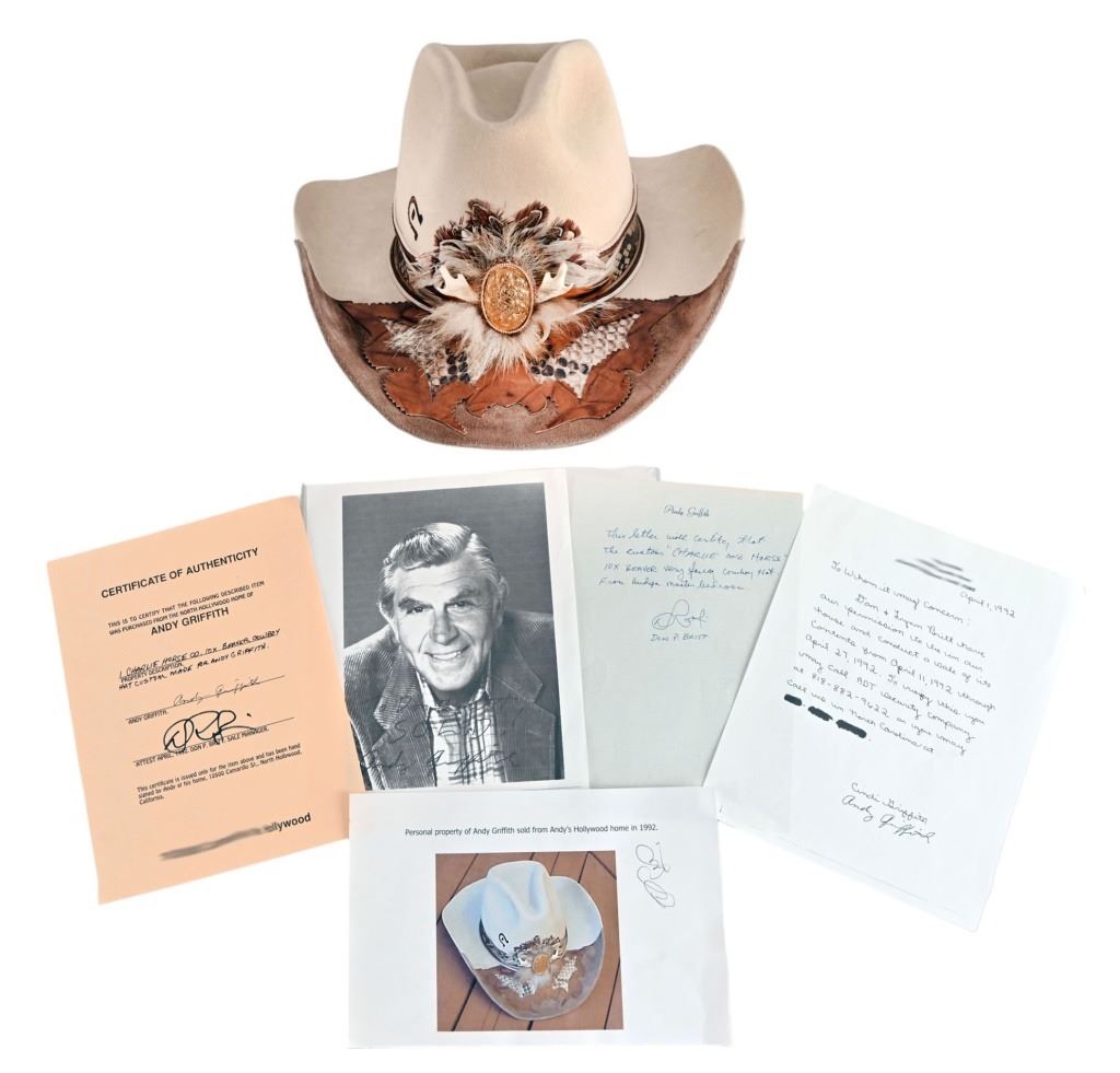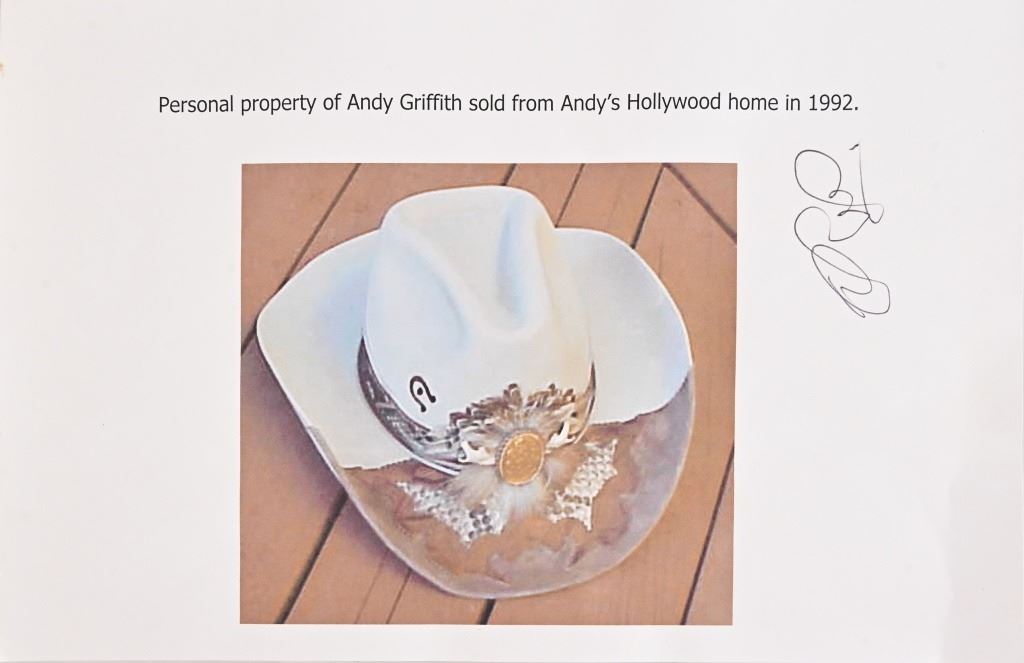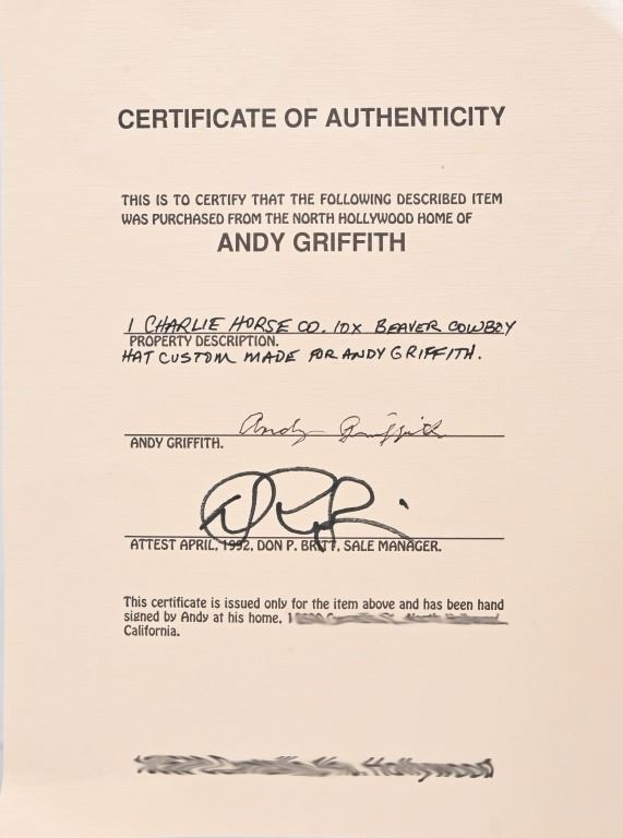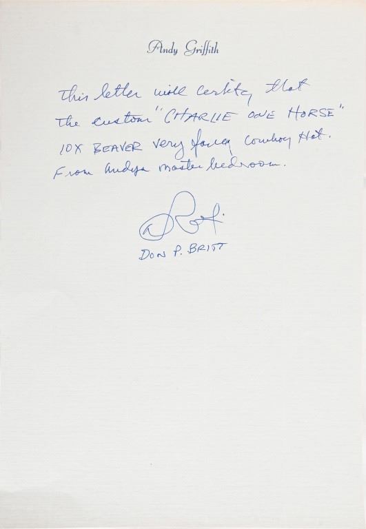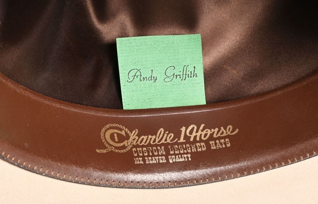 10x Beaver Charlie One Horse cowboy hat, personalized inside to Andy Griffith. Purchased from his Hollywood home in 1992, with COA signed by Andy Griffith and letters attesting to estate. Includes "Benjamin Matlock, Attorney At Law", business card