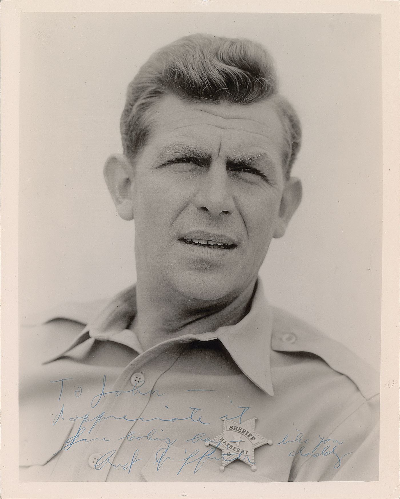 Glossy 8 x 10 close-up photo of Mayberry Sheriff Andy Taylor, signed and inscribed in blue ballpoint, "To John—I appreciate it, fine looking boy—like your daddy, Andy Griffith.” In fine condition, with a small chip to the top border.