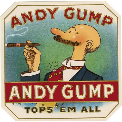 <B><I>Andy Gump Tops 'Em All</B></I></B></I> <B>Cigar Label.</B></I> An amusing lithographed 4.75" x 4.75" outer label with gold embossed highlights. Andy Gump was the "star" of the popular comic strip about a totally ordinary middle class family, <I>The Gumps,</B></I> led by a blowhard husband and father named Andy. The strip, created by Sidney Smith, ran for 42 years, from 1917 until 1959, though its peak was in the late 1910s and early 1920s when the animated shorts and two-reel comedies were being released (directed by Norman Taurog, later the director of many of Elvis Presley's movies). That helps date this label to that general period and speculation that it was possibly tied in to Andy Gump's campaign for congress in 1922 or for president in 1924. Near mint condition. This label is listed as one of the "InStone 100" blue chip cigar labels.<BR><BR><b>Shipping:</b> Small Flat (<a target="_blank" href="http://www.heritageauctions.com/common/shipping.php">view shipping information</a>)