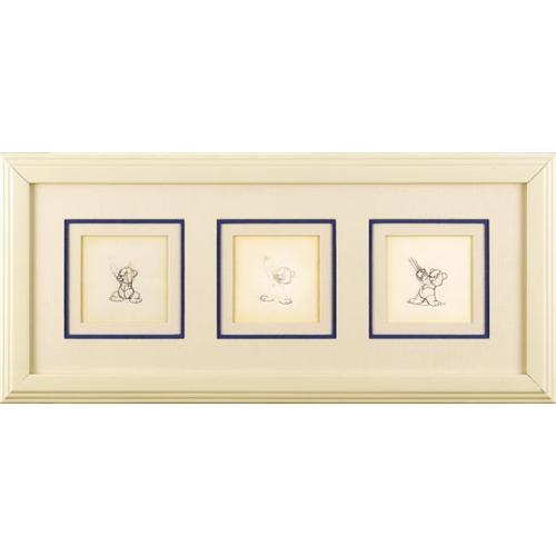 <B>Andy Panda "Catching the Ball" Original Preliminary Animation Art (Walter Lantz Productions, circa 1940).</B></I> The Walter Lantz Studio scored a big hit in 1939 with the introduction of Andy Panda, who was inspired by the national attention given the Chicago Zoo after an exotic panda bear was donated. At first, the Andy Panda cartoons featured Andy as a young boy with a gruff papa; these three penciled preliminary drawings are from that early era. In the 6" x 6" panels. Andy reaches to catch a baseball. The first two drawings are somewhat loose and sketchy, while the last is a tightly penciled rendition of the character. The sketches have been beautifully matted and framed, to an overall size of 34.5" x 15.5". In Excellent condition.