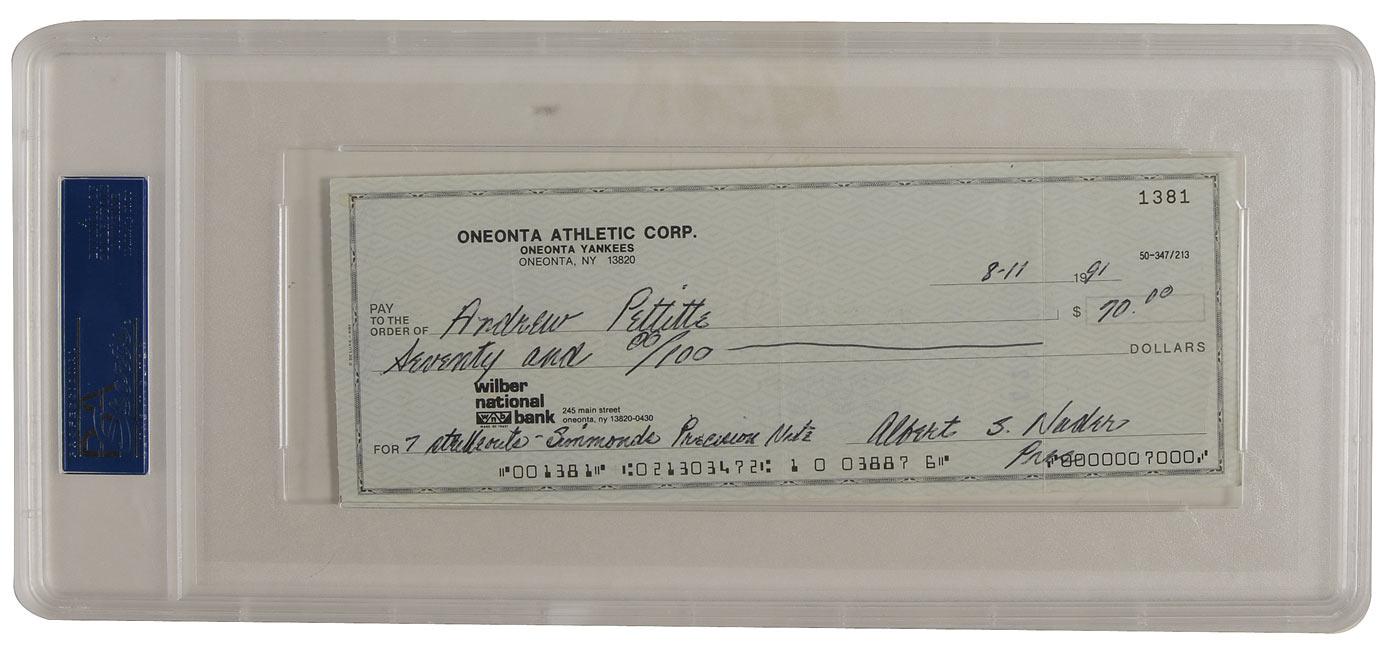 Rare Oneonta Athletic Corp. business check, 8 x 3, filled out and signed in another hand, payable to Pettitte for $70.00, August 11, 1991, and endorsed on the reverse “Andy Pettitte.” Note in memo field reads, “7 strikeouts-Simmons Precision Note.” Encapsulated in a plastic PSA/DNA authentication holder. In fine condition, with two vertical folds and expected stamps to reverse, none affecting endorsement. Pettitte played Single-A ball for Oneonta in 1991.