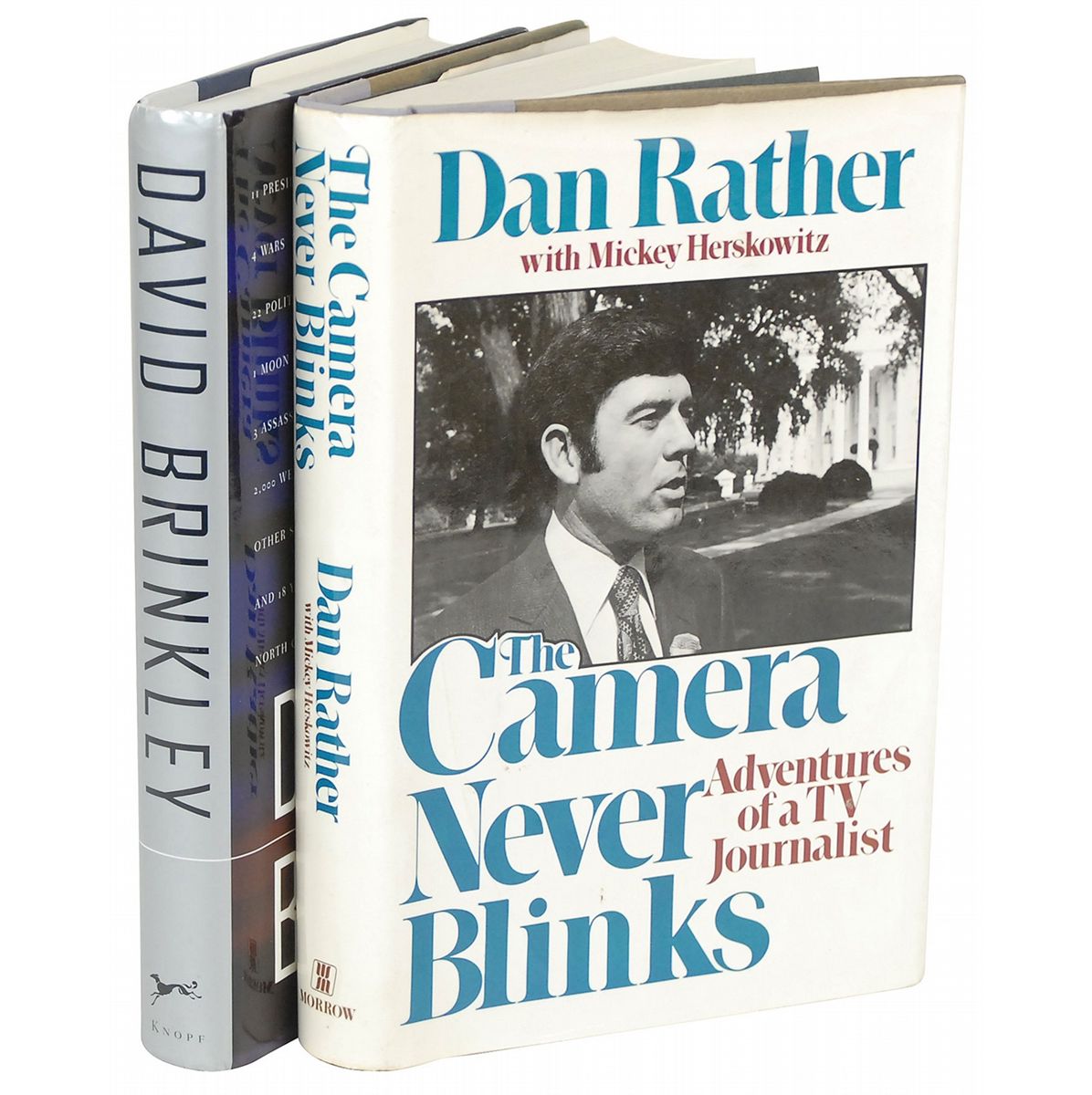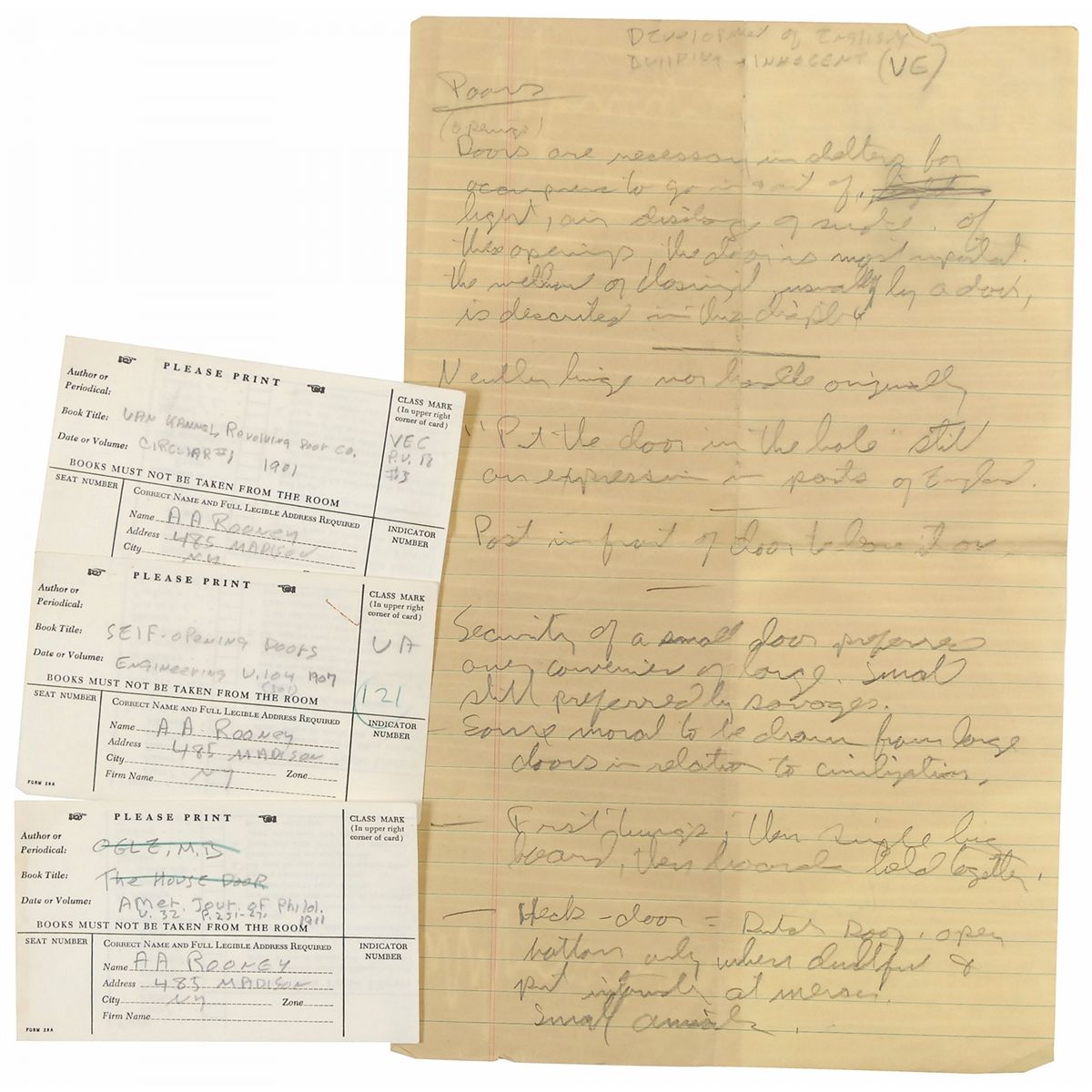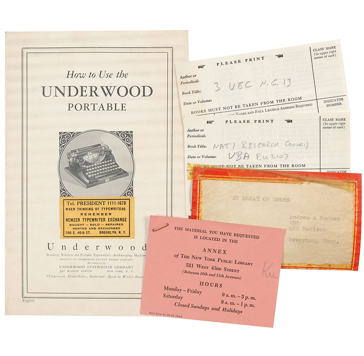 Small archive of material from early in Rooney's career, primarily comprised of material related to his first television essay, 'An Essay on Doors.' This is highlighted by Rooney's handwritten notes in pencil on a lined 8 x 12.5 sheet, no date but circa 1964. "Doors are necessary in shelter for occupants to go in & out of, light, air discharge of smoke. Of these openings the door is most important." Also included are the library slips from books Rooney borrowed during the course of his research, three filled out in pencil and signed by Rooney, "A. A. Rooney," listing titles such as "Van Kannel Revolving Door Co.," "Self-Opening Doors," and "The House Door." Includes two other unsigned library slips, as well as Rooney's Underwood typewriter manual. Also includes books signed and inscribed by his colleagues, including The Camera Never Blinks, signed and inscribed, "For Andy Rooney—who has helped with so much for so long. In admiration and with appreciation, from his friend, Dan Rather, July, 1977, New York," and David Brinkley's biography, signed and inscribed, "To Andy Rooney—I can't offer a motorized skateboard, but I can, and do, wish you a great new year! David Brinkley." In overall very good condition, with scattered creases and significant toning to the page of notes. Accompanied by a transcript of the ‘Essay on Doors’ as it was finally presented, in which several of the thoughts jotted down on this note page were clearly incorporated. A fascinating, early example of Rooney’s process in creating his pioneering television format.