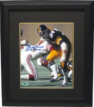 Andy Russell wore number 34 as an outside linebacker for the Pittsburgh Steelers in 1963 and from 1966-1976, the two-year gap being from when Russell temporarily left the team for the Army. He was an early member of Pittsburgh's famed Steel Curtain defense, and was named the Steelers' MVP in 1971. He made seven Pro Bowl appearances—in 1969 and from 1971 through 1976—and earned two Super Bowl rings in Super Bowl IX and Super Bowl X. Andy Russell has hand autographed this Pittsburgh Steelers 8x10 Photo with 2X SB Champs inscription. MAB Hologram and Certificate of Authenticity from Athlon Sports. Custom Black Mat and Premium Black Frame as shown.