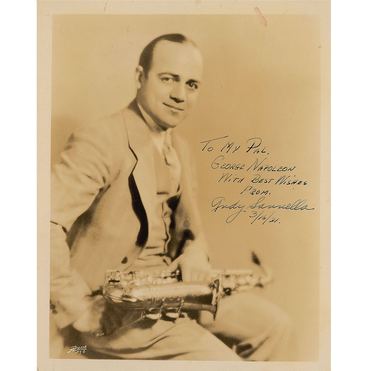 Multi-instrumentalist musician and bandleader (1900–1962). Vintage glossy 8 x 10 photo of Sannella posing with a saxophone across his lap, signed and inscribed in fountain pen, “To my pal George Napoleon, with best wishes, from Andy Sannella, 3/16/31.” A small water spot at the top with a drip slightly affecting a couple letters of the inscription, otherwise fine condition.
