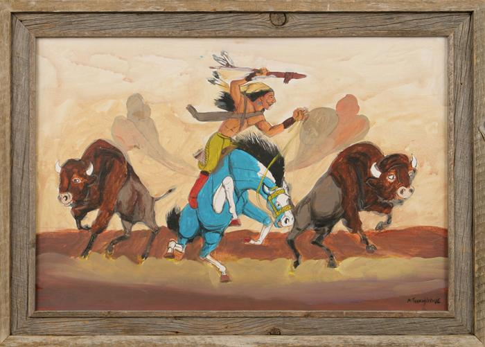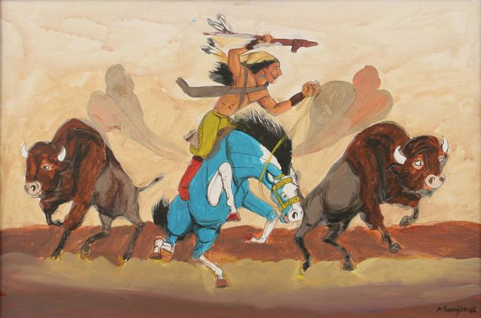 Andy Van Tsinajinnie (1916-2000). Buffalo Hunt. 24" x 36" oil on canvas board. signed lower right. Condition Report: Black lights clean.