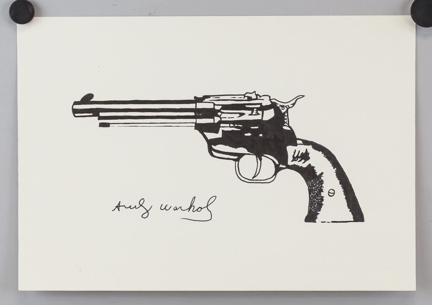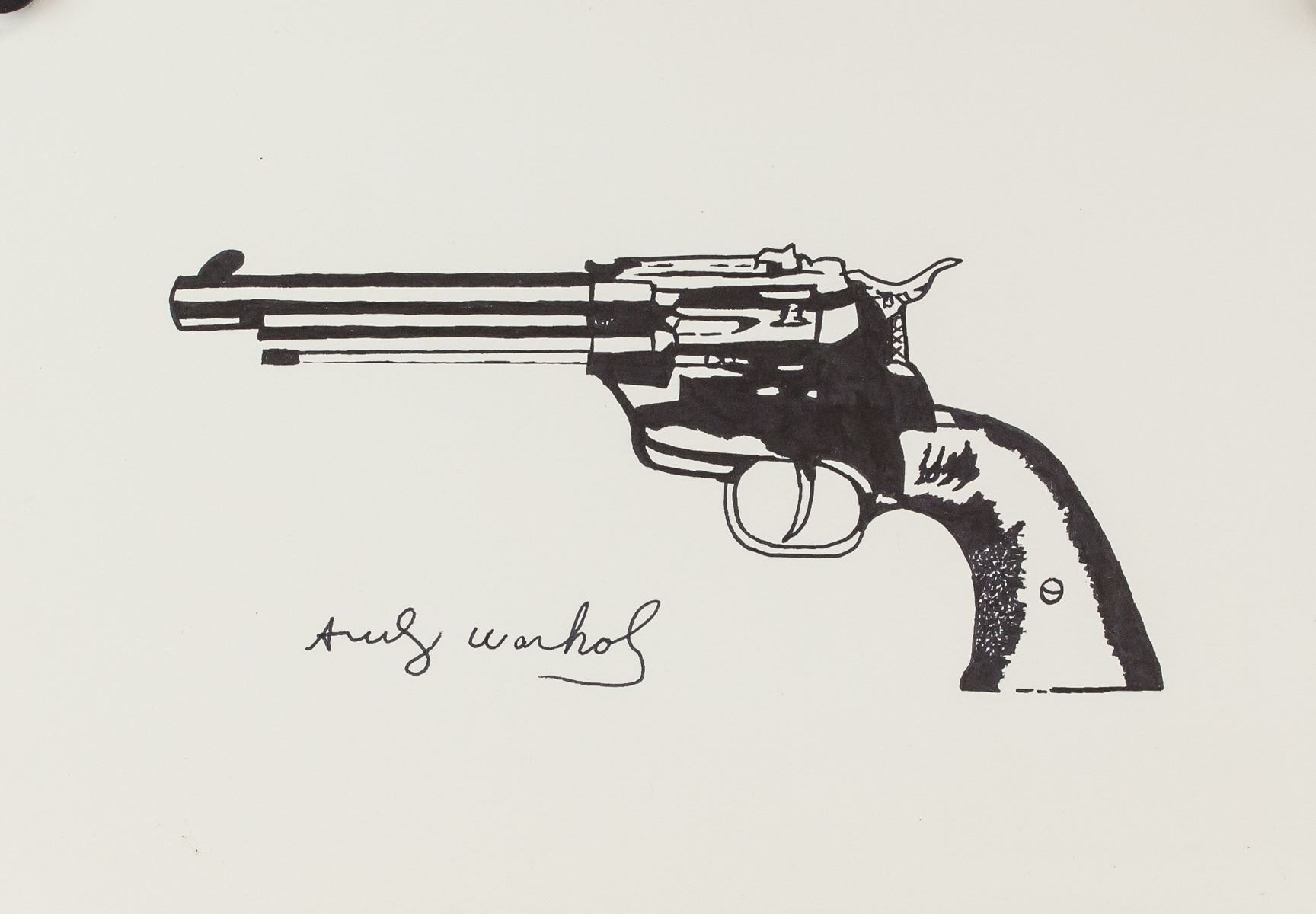 Ink on paper, framed. Featuring a revolver. Signed Andy Warhol on the lower left corner. Label affixed to verso inscribed Arthur Tooth Gallery London, England. Also stamped THE ESTATE OF ANDY WARHOL and inscribed VF in pencil on verso. Attributed to Andy Warhol (1928-1987, American). 21 x 12 cm (8.5 x 12 inches). PROVENANCE: This lot carries limited provenance from a Central American estate (Chicago)