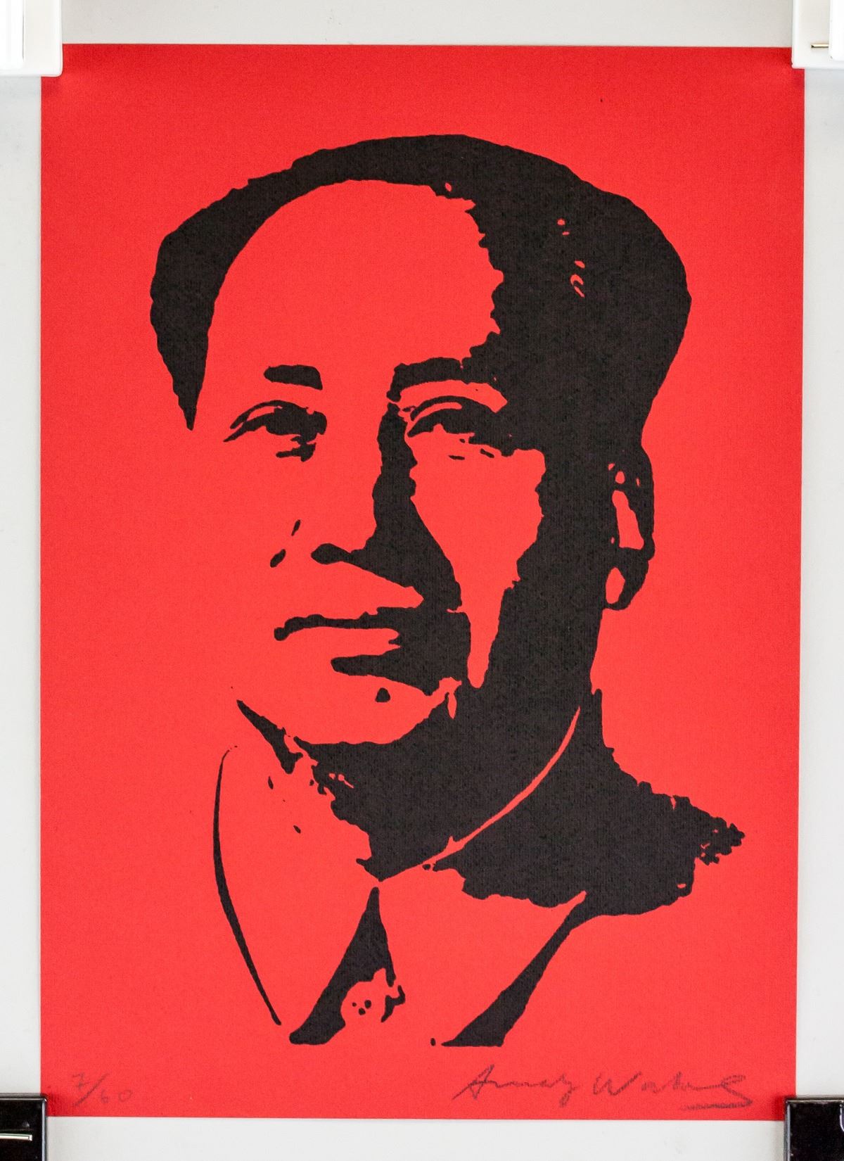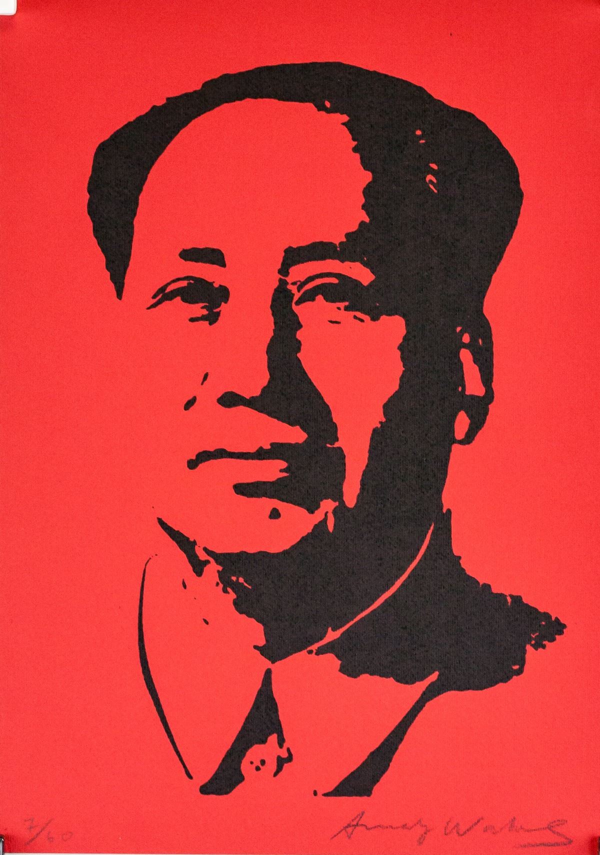 Lithograph on paper. Featuring portrait of Mao Zedong. Signed Andy Warhol and inscribed 7/60 on the lower right and lower left corner, respectively. Inscribed AW. 355.61 and stamped illegibly on verso. Attributed to Andy Warhol (1928-1987, American). 29.5 x 21 cm (11.5 x 8.25 inches)