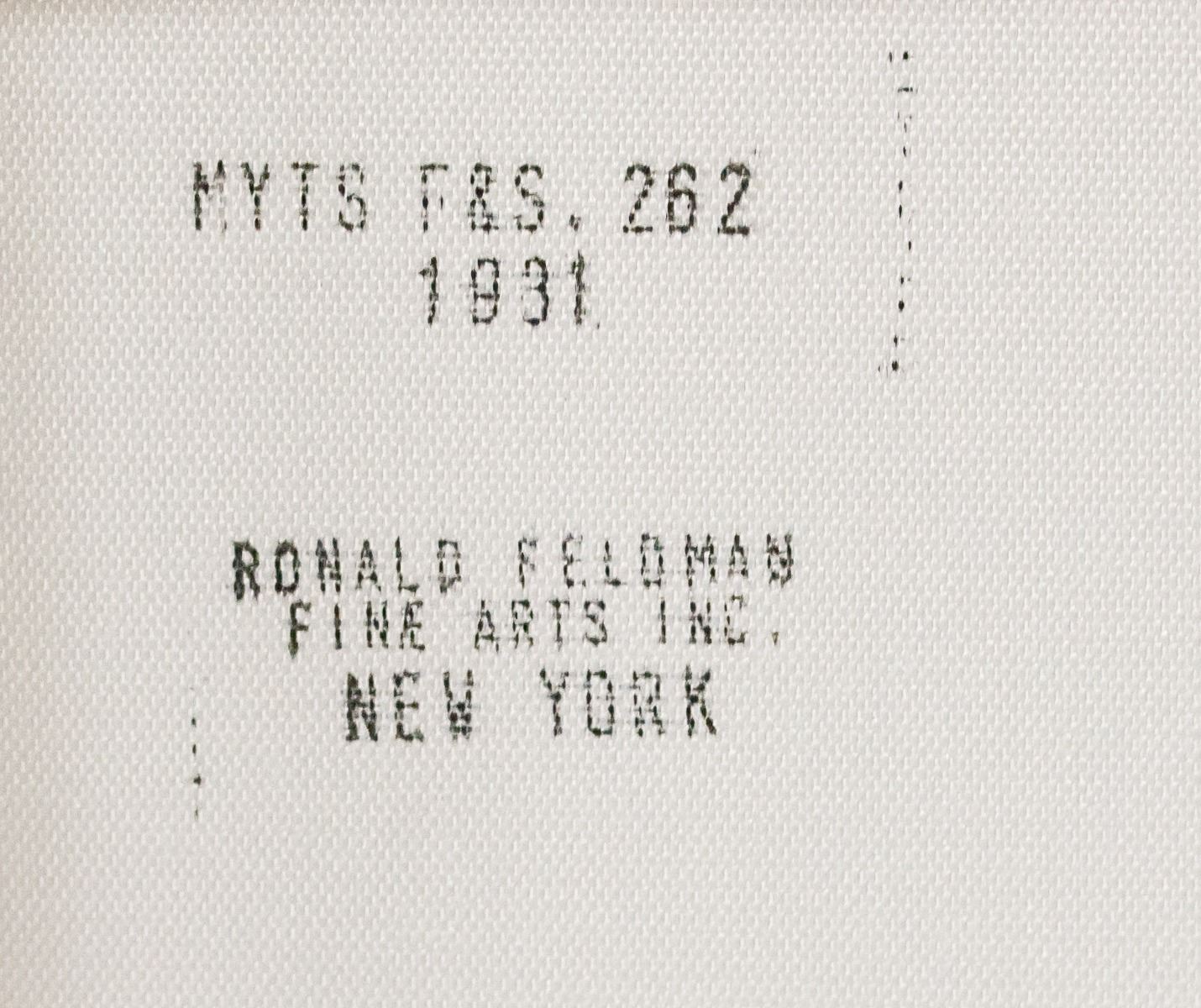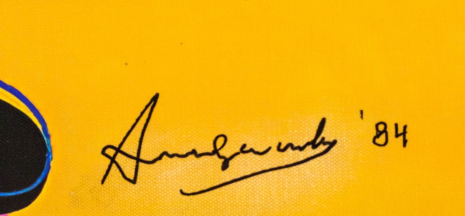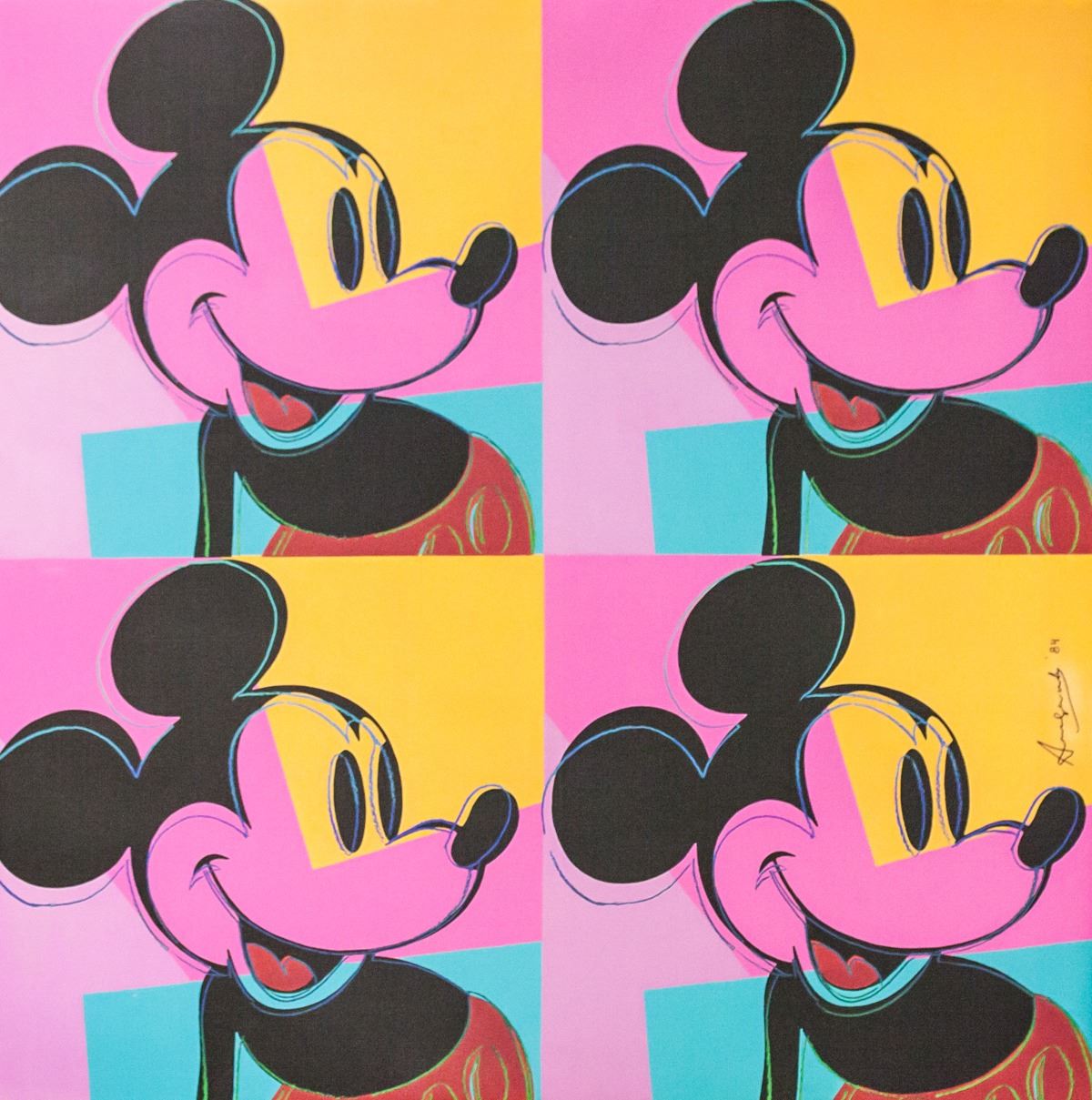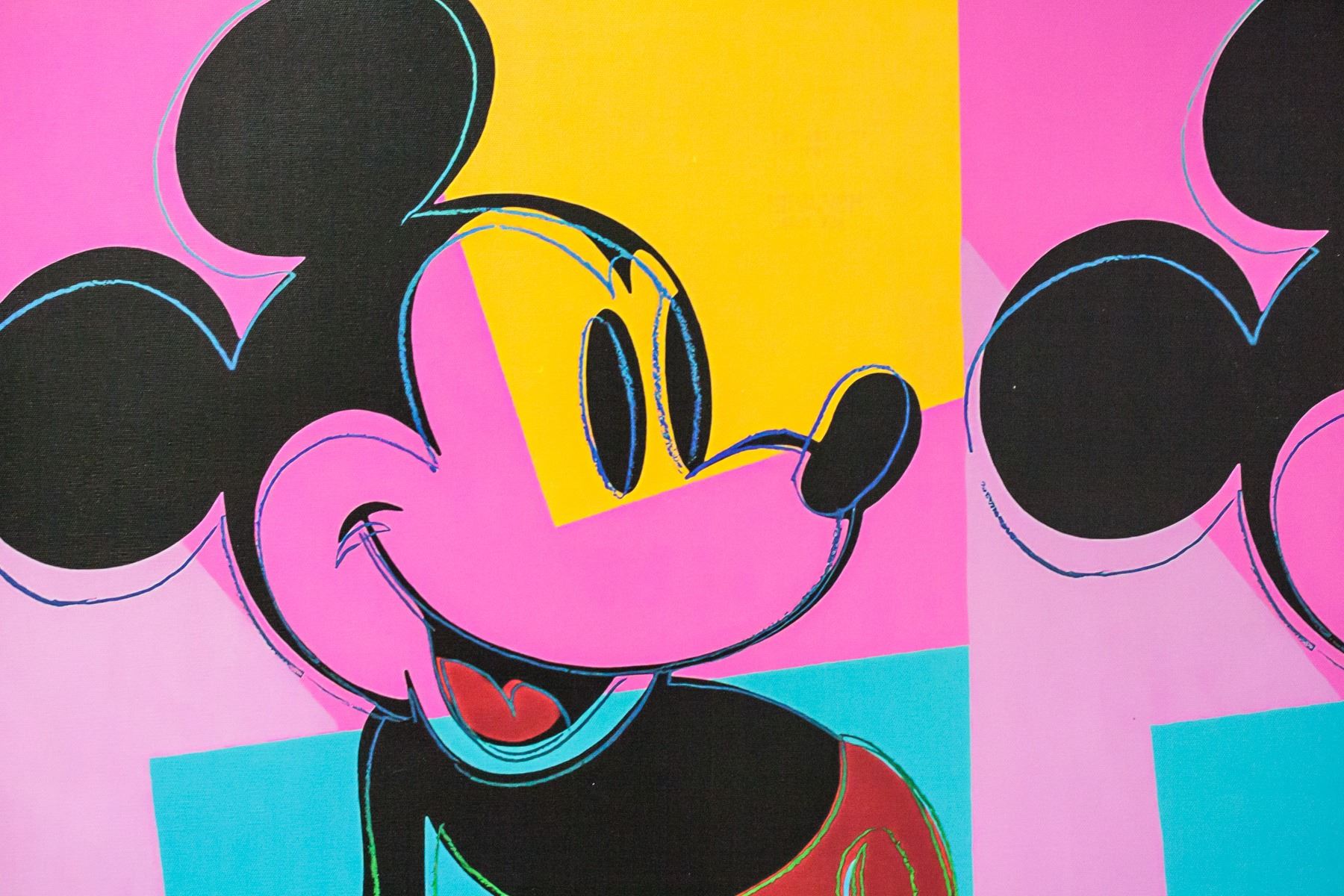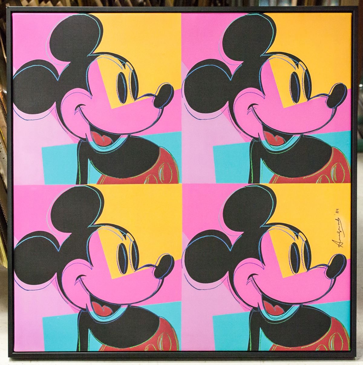 Giclee on canvas, framed. Featuring Mickey Mouse. Signed "Andy Warhol" to the right. "84" inscribed beside the signature. Stamps on verso read "MYTS F&S" and "RONALD FELDMAN FINE ARTS INC". Attributed to Andy Warhol (1928-1987, American). 95 x 95 cm (37.5 x 37.5 in).