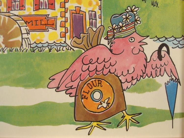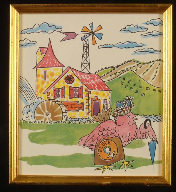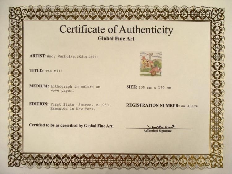 This print is a charming, colorful image from the Pop Art icon. Artist: Andy WarholTitle: The MillDate: Circa 1958Medium: Lithograph in colors on wove paperImage size: Approximately 5 x 5 1/2 inchesFraming: Matted in black with gold inner frame, in decorative gold painted wood frameFrame size: 21 3/4 x 20 1/2 inchesEdition: First State Rarity: ScarceCondition: ExcellentCertificate of Authenticity: From Global Fine Art