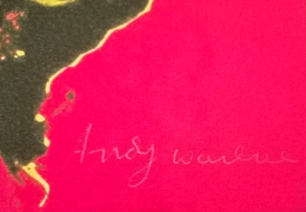 Warhol's 1967 image of Marilyn in shocking pink background. Signed by Andy Warhol in pencil in right hand corner. Warhol produced a number of these images of Marilyn taken from the film Niagara, mixing different colours together. About repetitions Warhol said, "The more you look at the same exact thing, the more the meaning goes away, and the better and emptier you feel."