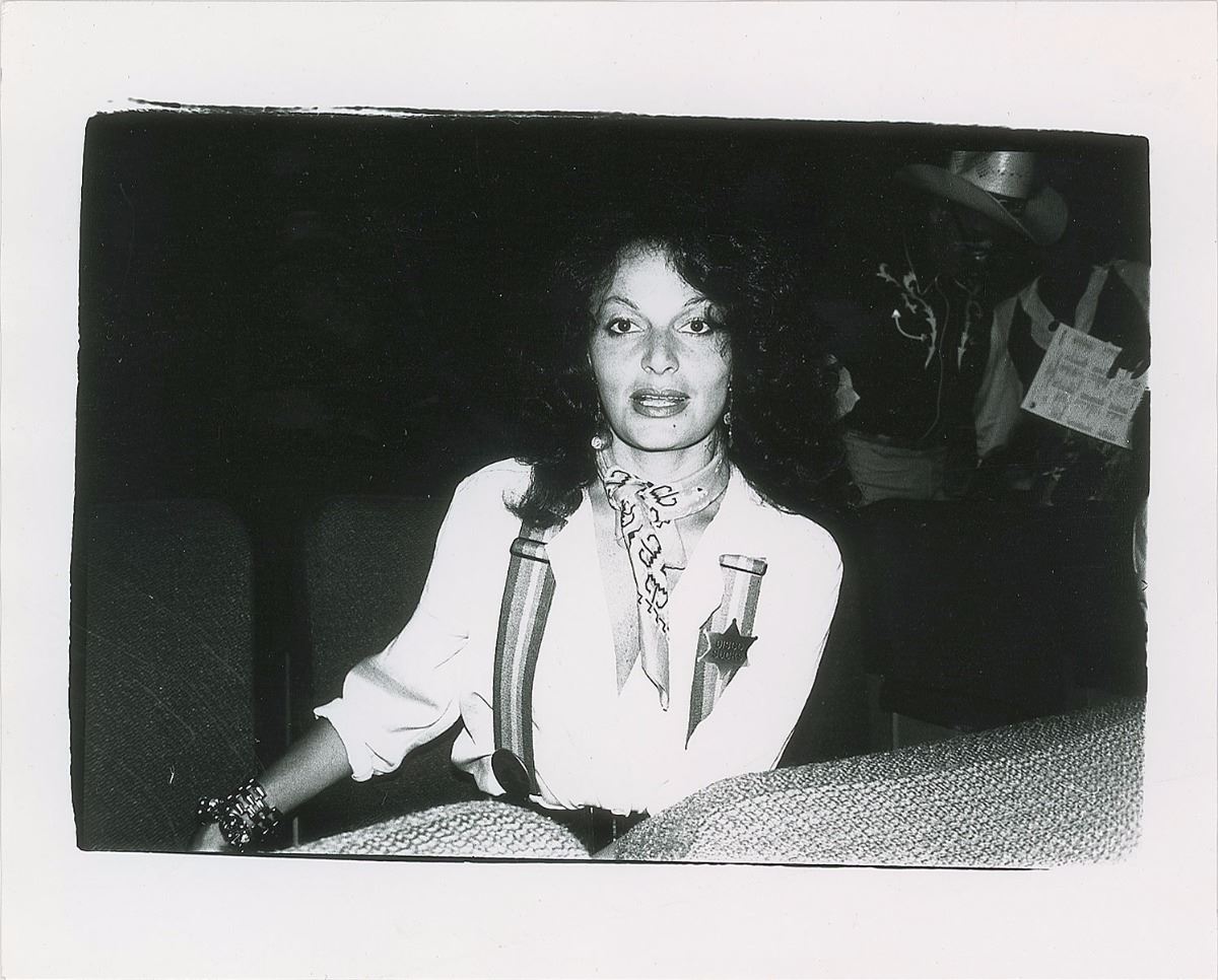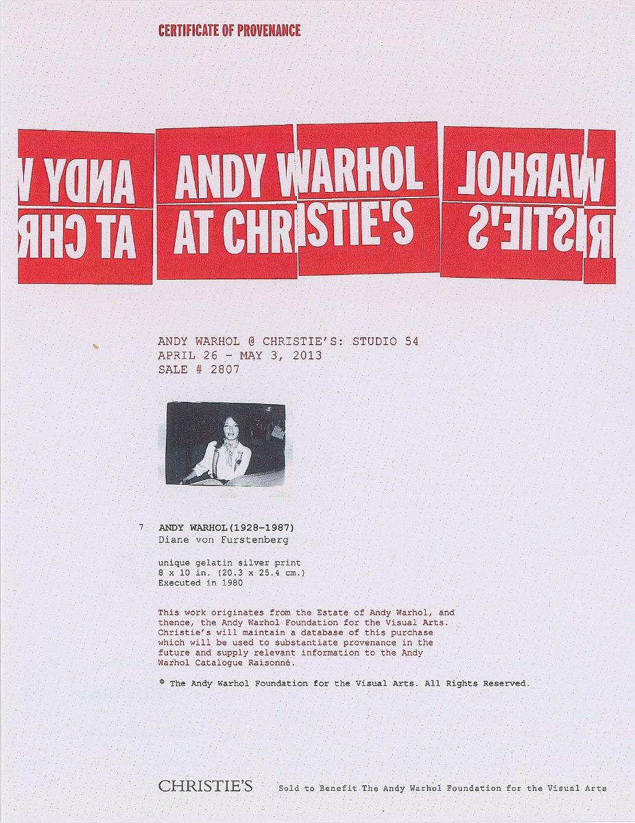 Desirable 10 x 8 gelatin silver photograph by Andy Warhol showing famed fashion designer Diane von Furstenberg at the June 1980 premiere for the film Urban Cowboy. Executed in 1980. Reverse bears Estate of Andy Warhol and The Andy Warhol Foundation for the Visual Arts stamps, with pencil notations along bottom edge, “FL04.00176.” In fine condition. Accompanied by its original folder and Certificate of Provenance from Christie’s. This work is part of a database maintained by Christie's to substantiate provenance in the future and supply relevant information to the Andy Warhol Catalogue Raisonne. A lovely image deriving from the personal collection of the influential pop artist.