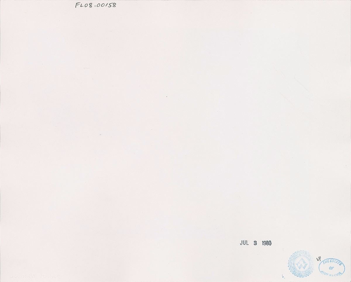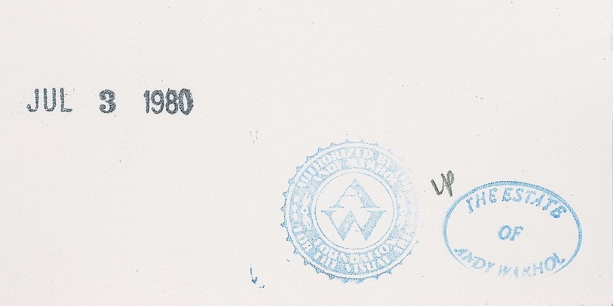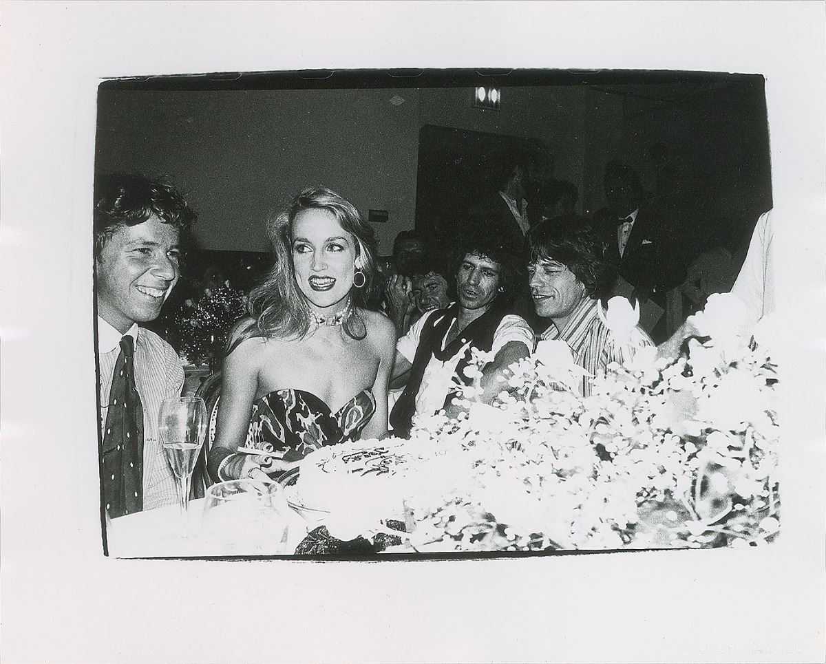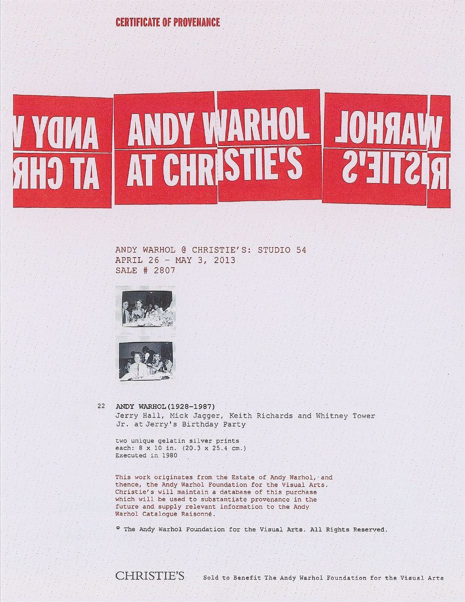 Exceptional 10 x 8 gelatin silver photograph by Andy Warhol showing Mick Jagger, Keith Richards, and Jerry Hall at the latter’s birthday party at Studio 54 on July 3, 1980. Executed in 1980. Lower right corner bears an Andy Warhol blindstamp. The reverse bears Estate of Andy Warhol and The Andy Warhol Foundation for the Visual Arts stamps, pencil notations along top edge, “FL08.00158,” and is stamp-dated, “Jul 3 1980.” In fine condition. Accompanied by its original folder and Certificate of Provenance from Christie’s. This work is part of a database maintained by Christie's to substantiate provenance in the future and supply relevant information to the Andy Warhol Catalogue Raisonne. Deriving from the personal collection of the influential pop artist, this photo vividly captures the extravagant nightlife of the famed Studio 54.