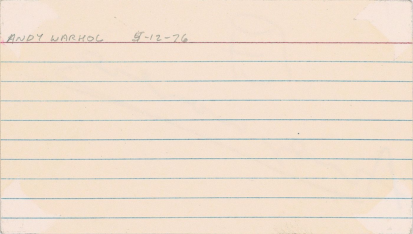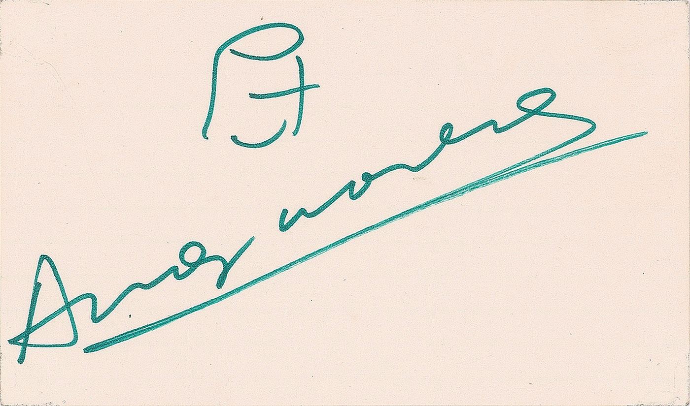 Green felt tip signature, "Andy Warhol,” adding a small soup can on an off-white 5 x 3 card. Collector's pencil notations on the reverse indicate the signature was obtained on May 12, 1976. In fine condition.