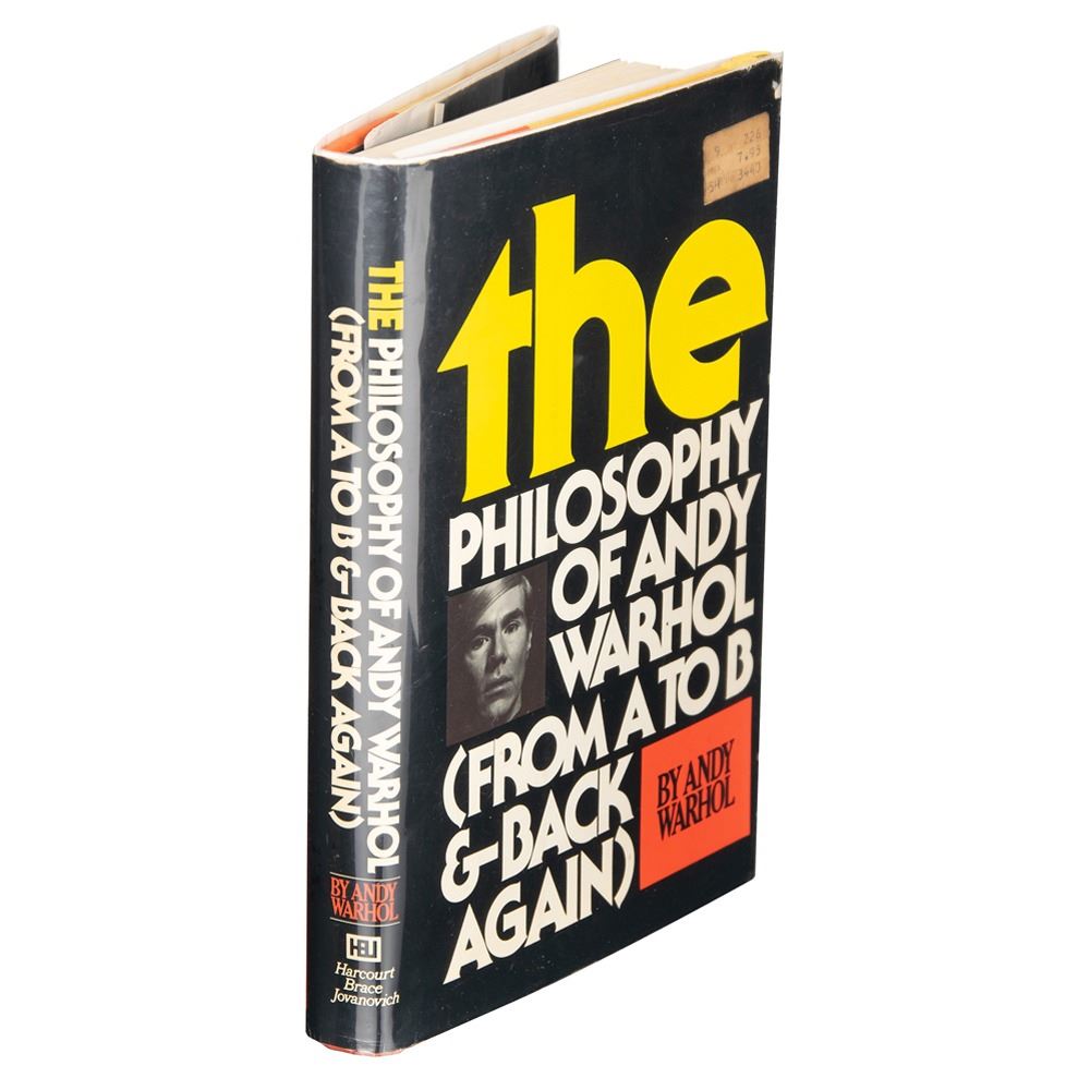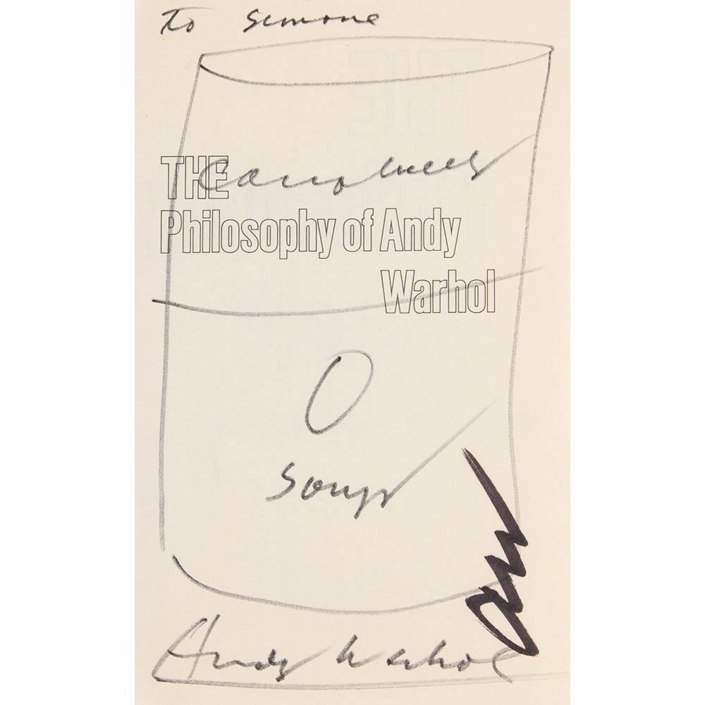 Signed book: The Philosophy of Andy Warhol (From A to B & Back Again). First edition. NY: Harcourt Brace Jovanovich, 1975. Hardcover with dust jacket, 5.75 x 8.5, 241 pages. Signed and inscribed on the half-title page in black felt tip, "To Simone, Andy Warhol," who adds a sketch of his classic "Campbell's Soup" can. In fine condition, with an old price sticker to the front of the dust jacket.