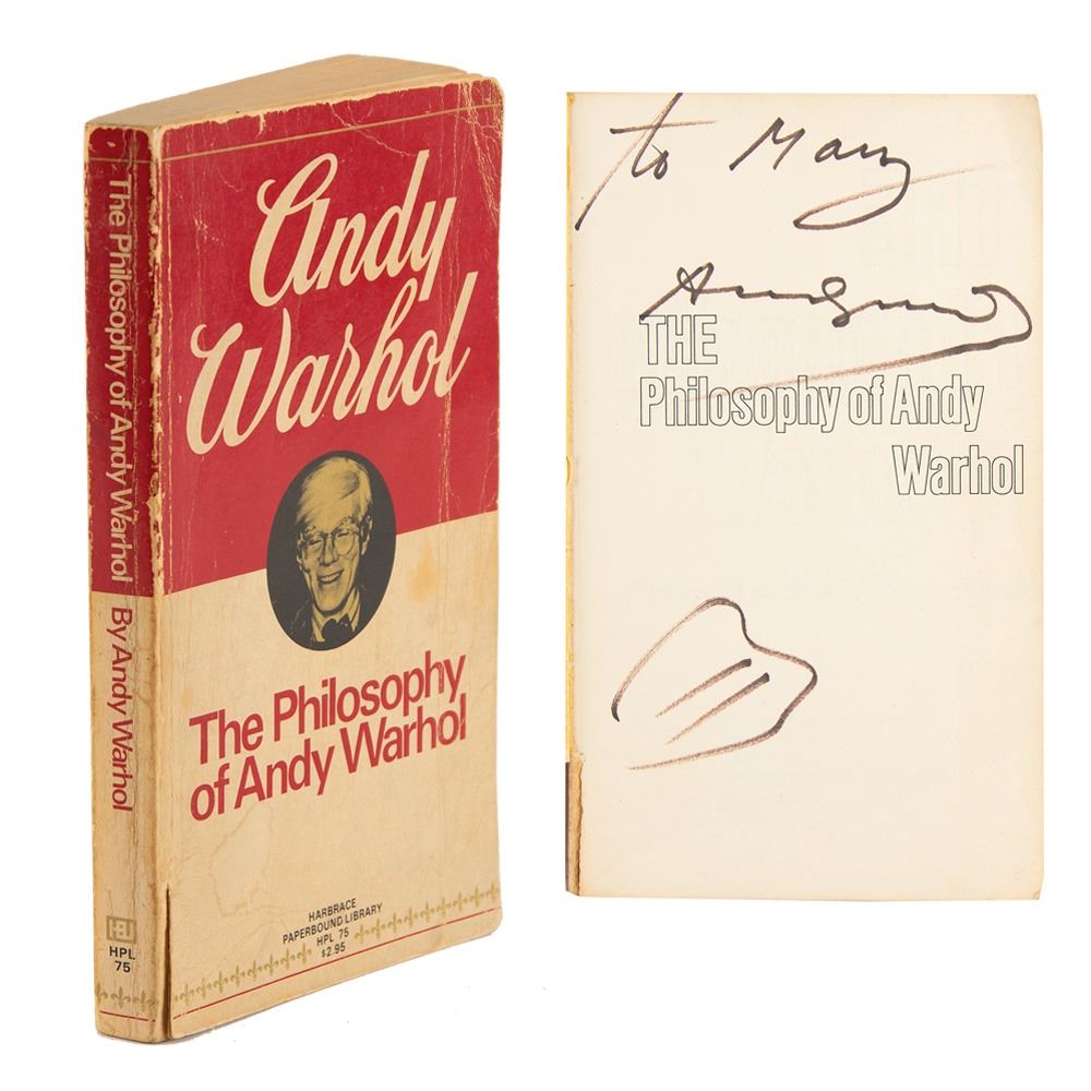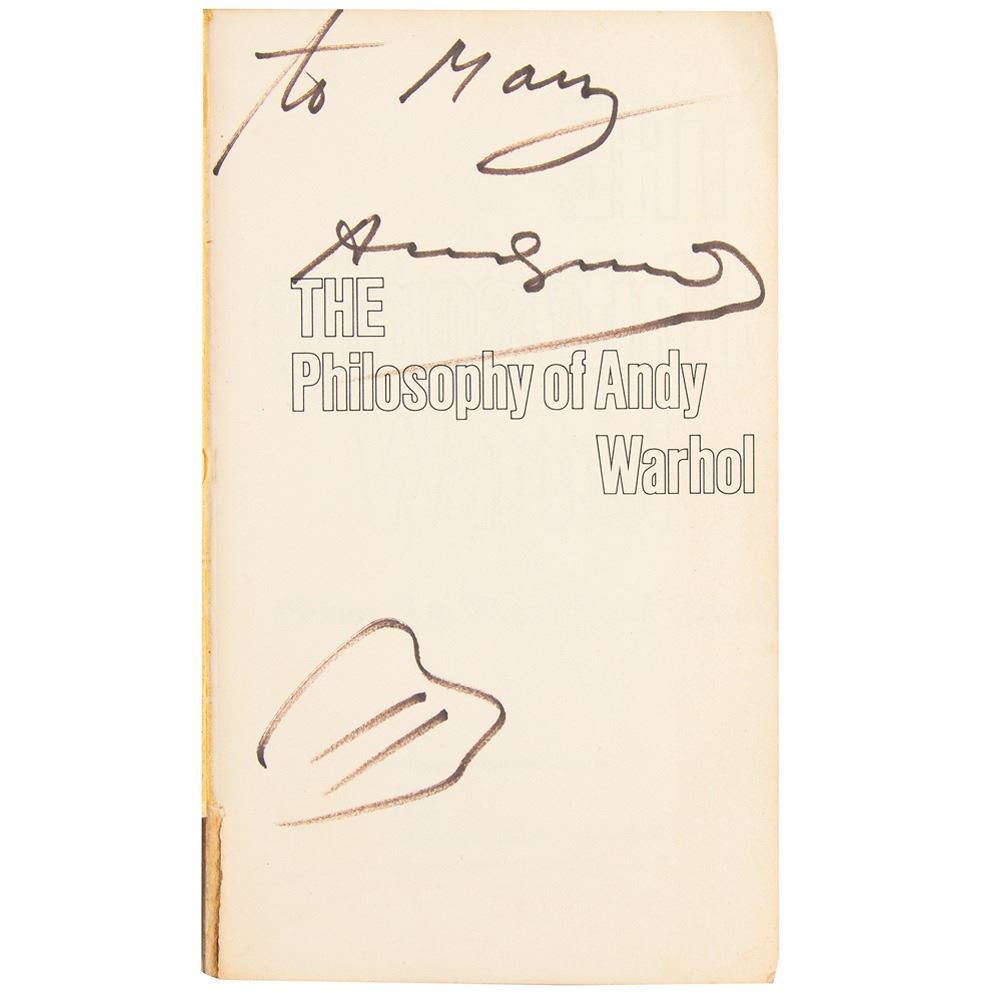 Signed book: The Philosophy of Andy Warhol. First Harbrace Paperbound Library edition. NY: Harcourt Brace Jovanovich, 1977. Paperback, 4.25 x 7.25, 241 pages. Signed and inscribed on the half-title page in black felt tip, "To Mary, Andy Warhol," who adds a small sketch of a woman's lips. In very good to fine condition, with heavy wear and creasing to the covers; interior pages are all fine. Accompanied by a full letter of authenticity from JSA.