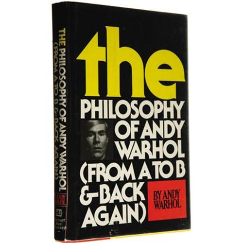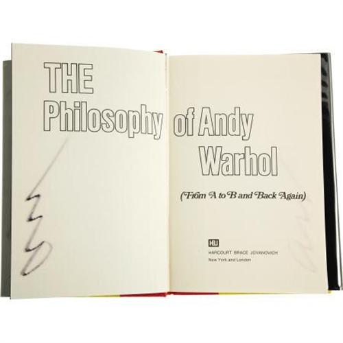 <B>Andy Warhol: Signed First Edition of <I>The Philosophy of Andy Warhol (From A to B & Back Again)</B></I></B></I> (New York and London: Harcourt Brace Jovanovich, 1975), first edition, 241 pages, yellow paper boards shelf-backed in red cloth with black and white spine lettering, 8vo (5.5" x 8.5"), dust jacket. Signed "<I>AW</B></I>" on the half title page. Book and dust jacket are about fine.<BR><BR><b>Shipping:</b> Books & Catalogs (<a target="_blank" href="http://www.heritageauctions.com/common/shipping.php">view shipping information</a>)