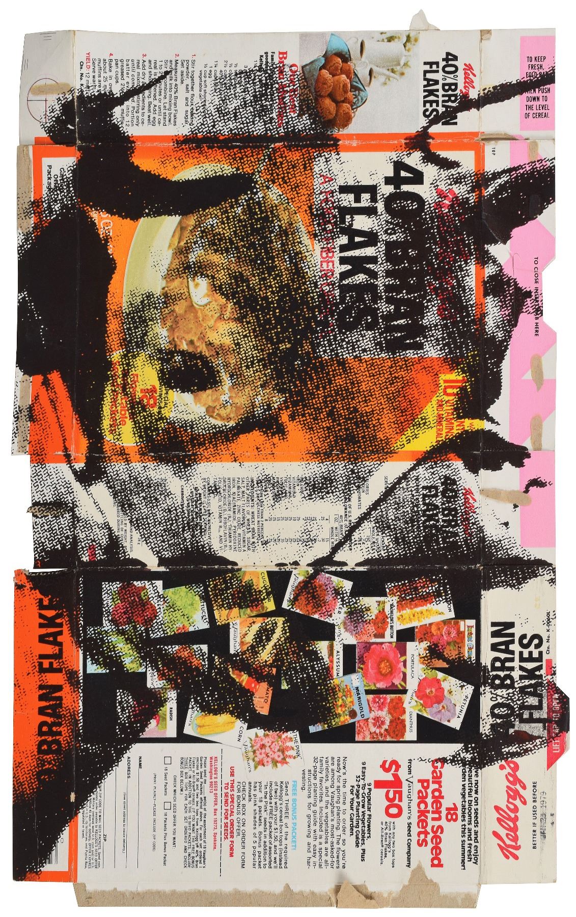Original one-off 'Cow' screen print by Warhol on an unfolded cereal box for Kellogg's 40% Bran Flakes, 13 x 19.5, signed and inscribed on the reverse in black felt tip, "To Yelitza, Andy Warhol." Also bears an "Andy Warhol" stamp near the bottom of the reverse. Box is marked with a "Better If Used Before" date of January 23, 1979. In fine condition, with expected wear to the edges. The recipient of this piece was Yelitza Karolyi, who was a New York City model in the 1970s and 80s. She befriended artists such as Warhol and photographers such as Peter Beard, and today is a fine artist herself.