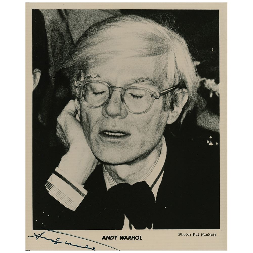 Glossy 8 x 10 promo photo of Warhol with his eyes closed taken by Pat Hackett, signed in the lower border in black felt tip, "Andy Warhol." In fine condition.