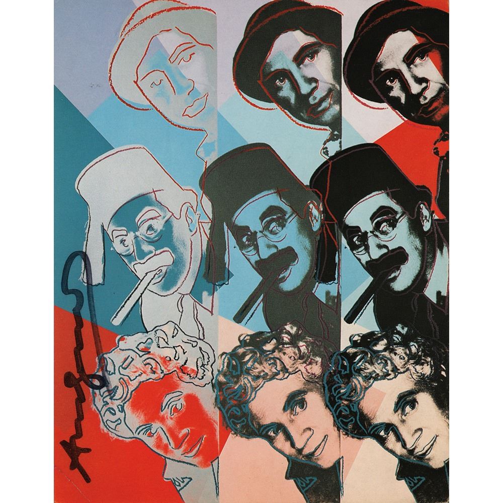 Appealing color 5.5 x 7 promo card featuring Andy Warhol's 1980 work 'The Marx Brothers,' featuring Groucho, Chico, and Harpo triplicated in his inimitable Pop Art style, nicely signed in the lower left corner in black felt tip by Warhol. In very fine condition.