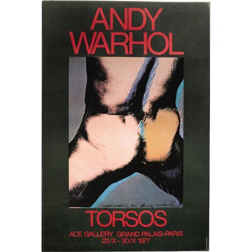 <B>Andy Warhol Signed "Torsos" Poster.</B></I> A 39" x 59" poster advertising Warhol's 1977 <I>Torsos</B></I> exhibit at the Gallery Grand Palais-Paris, with a large autograph by him in black marker. In Excellent condition.<I>Accompanied by LOA from PSA/DNA.</B></I><BR><BR><b>Shipping:</b> Framed - without Glass, Large (<a target="_blank" href="http://www.heritageauctions.com/common/shipping.php">view shipping information</a>)