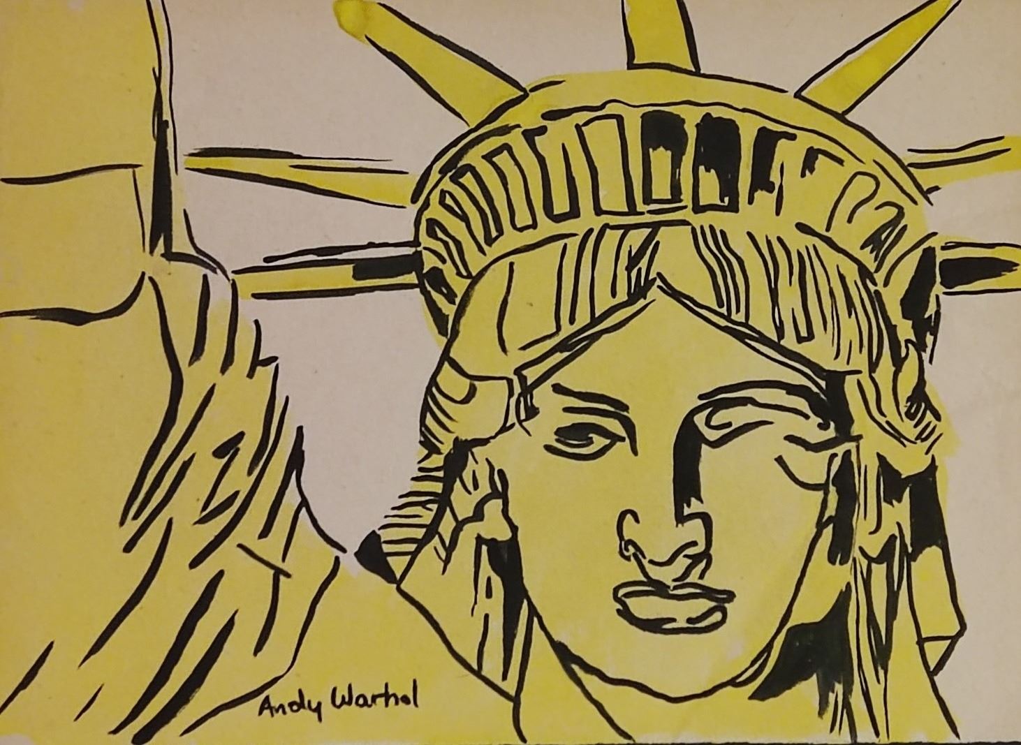 Upclose drawing of 'The Statue of Liberty' in yellow by Andy Warhol, estate stamped on the back, and supplied with 'Andy Warhol Foundation estate letter'.