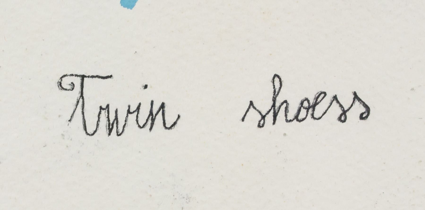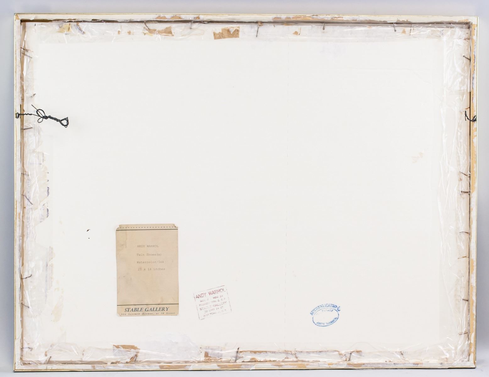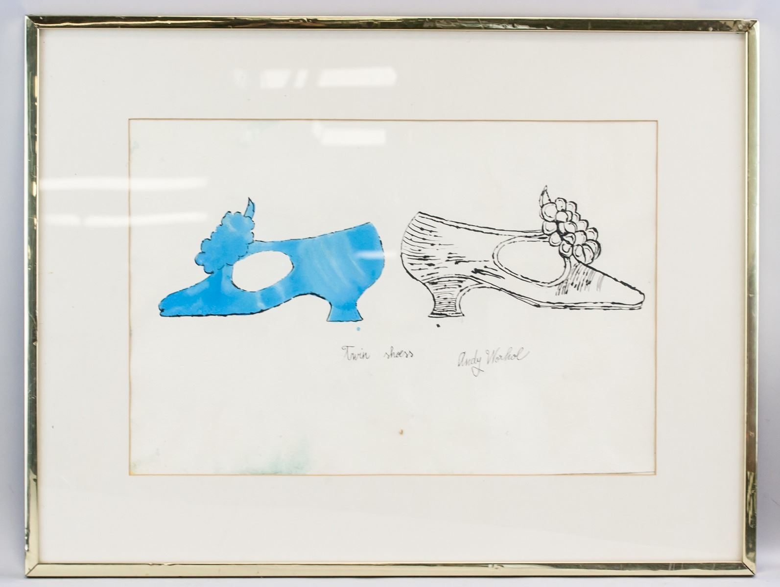Mixed media on paper. Featuring pair of heels. Inscribed Twin shoes underneath. Signed Andy Warhol. Gallery label affixed to verso inscribed ANDY WARHOL / Twin Shoes (s) / Watercolor/Ink / 21 x 14 inches / STABLE GALLERY / 924 Seventh Avenue, at 58 Street. Stamped ANDY WARHOL / Nov. Nov. 24 / PREVIEW NOW 657 / STABLE GALLERY / 33 EAST 74 ST. / NEW YORK 21, N.Y. on verso. Attributed to Andy Warhol (1928-1987, American). 36 x 53 cm (14 x 21 inches), framed: 57 x 75 cm (22.5 x 29.5 inches). Provenance: This lot carries limited provenance from a Toronto estate