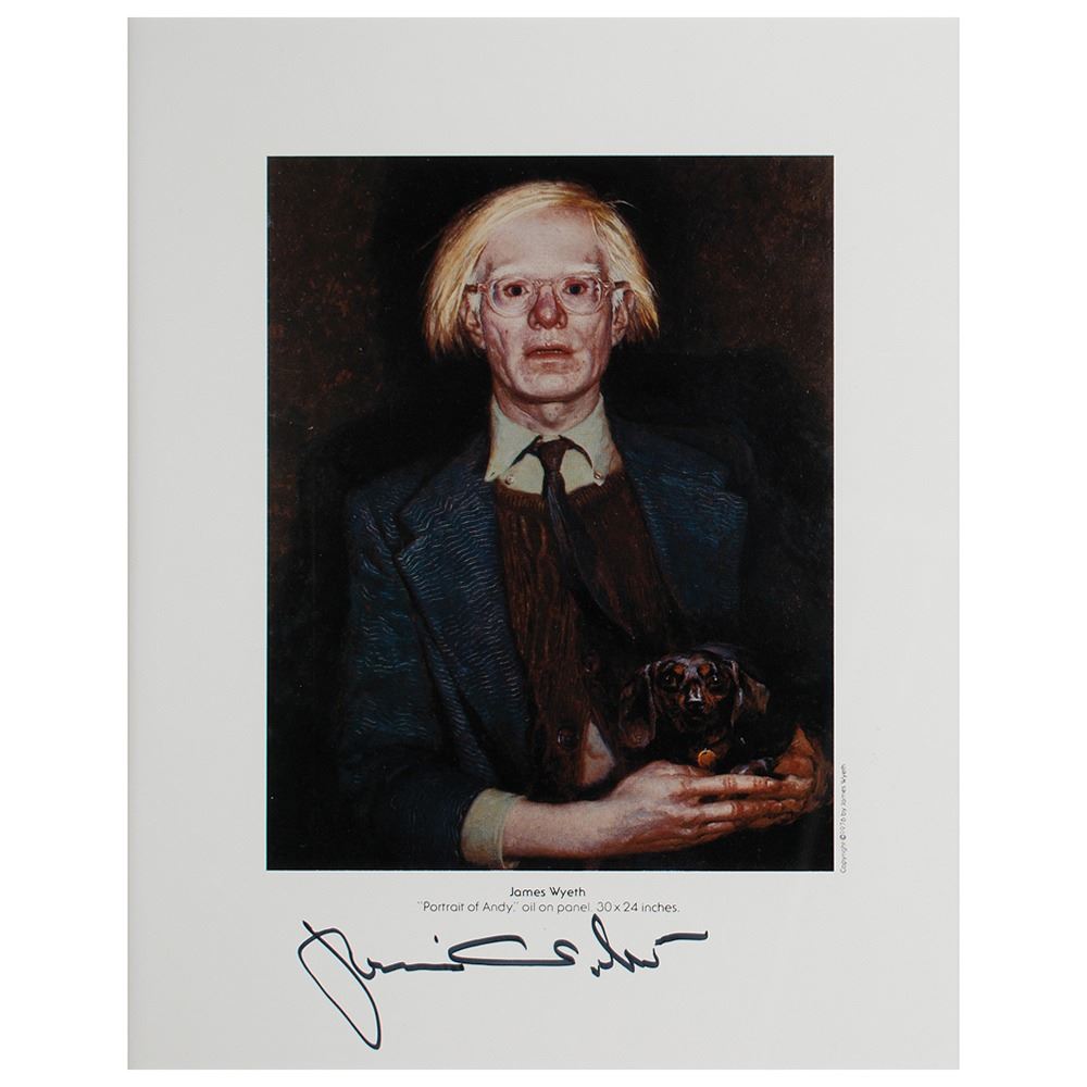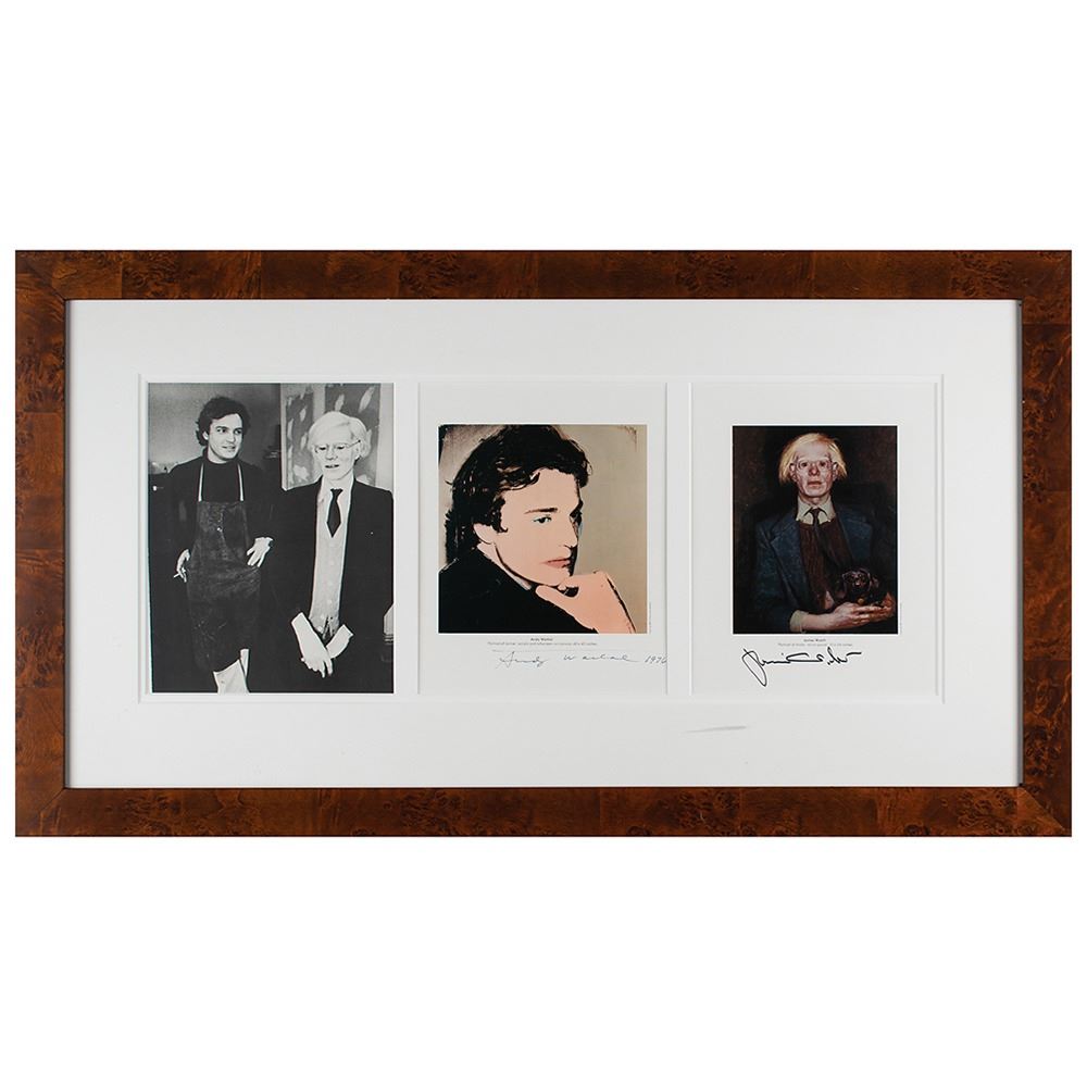 Unique and desirable pairing of color 7.5 x 9.5 prints: a portrait of Jamie Wyeth by Andy Warhol, signed in the lower border in black felt tip, "Andy Warhol, 1976"; and a portrait of Andy Warhol by Jamie Wyeth, signed in the lower border in black felt tip, "Jamie Wyeth." Handsomely double-matted and framed with a photograph of the two together to an overall size of 32.25 x 18. In fine condition.