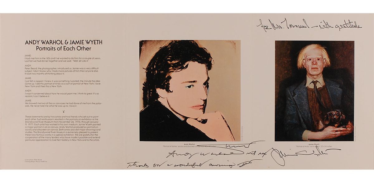 Tri-fold exhibit folder for “Andy Warhol & Jamie Wyeth Portraits of Each Other,” at the Brandywine River Museum, measuring 24 x 10 open, signed and inscribed inside in black felt tip by both Wyeth and Warhol, both signing by their respective images. In fine condition. Accompanied by a full letter of authenticity from PSA/DNA.