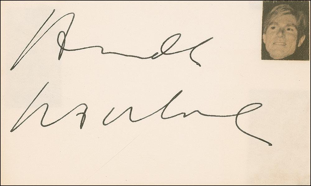 Unusually legible vintage ink in-person signature, “Andy Warhol,” on an off-white 5 x 3 card, with a small clipped photo affixed to top right. In fine condition, with light show-through from two clipped photos affixed to reverse.