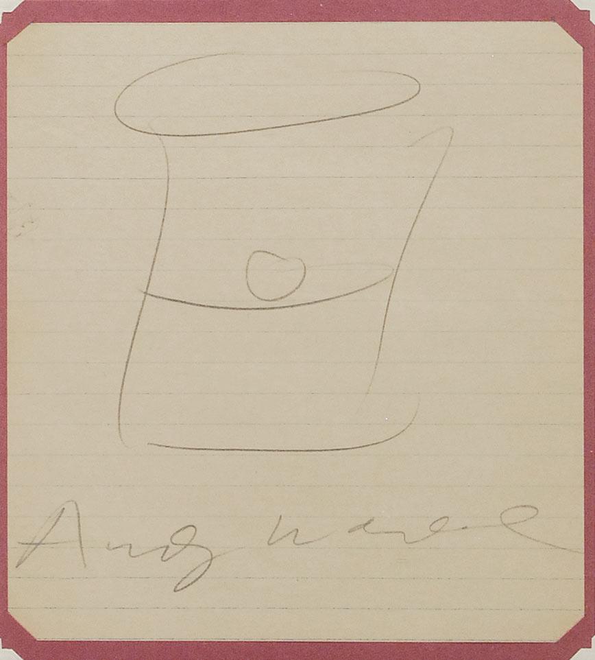 Large original signed pencil sketch of a Campbell soup can on an off-white lined 7.25 x 7.75 sheet, signed at the bottom “Andy Warhol.” Double-matted (with the corners hidden behind the first mat) and framed to an overall size of 12 x 15. In fine condition with a uniform shade of toning. A great opportunity to acquire an original sketch of the object that made Warhol the most renowned American pop artist.