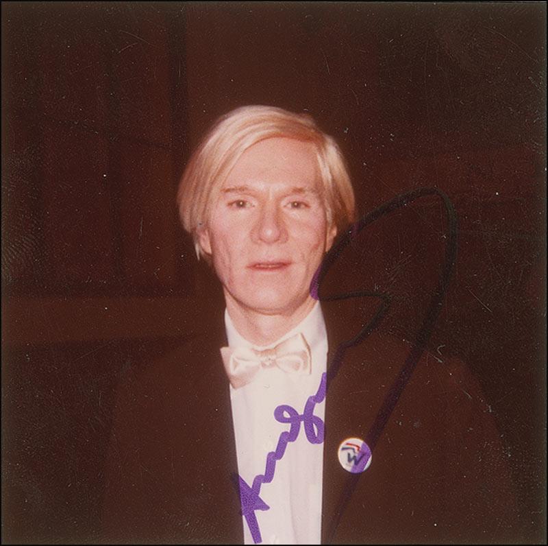 Color satin-finish 3.5 x 3.5 candid photo of Warhol smiling for the camera, signed in purple felt tip “Andy Warhol.” In fine condition, with somewhat poor contrast to his last name against the dark background.
