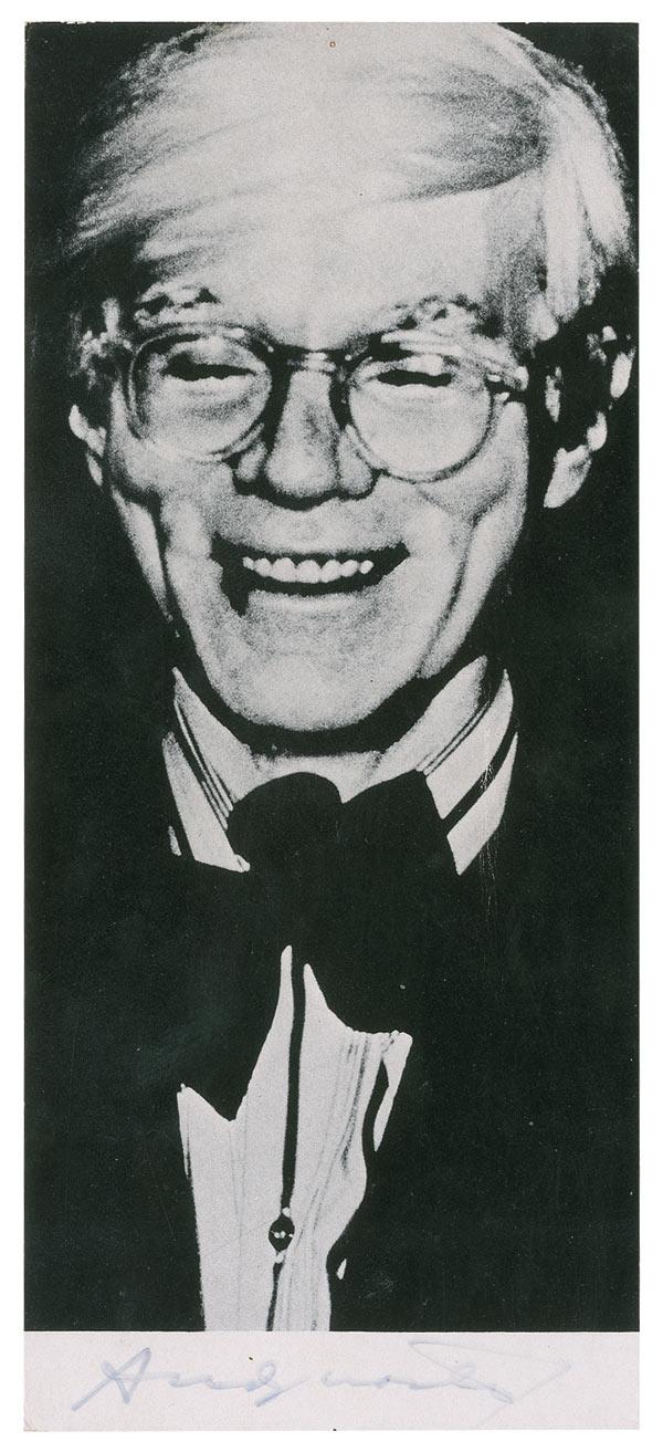 Interesting 4 x 9 cardstock photo of the smiling artist, signed in blue felt tip at the bottom white border “Andy Warhol.” Scattered creases and surface impressions, the signature somewhat faded, and the image a little grainy.