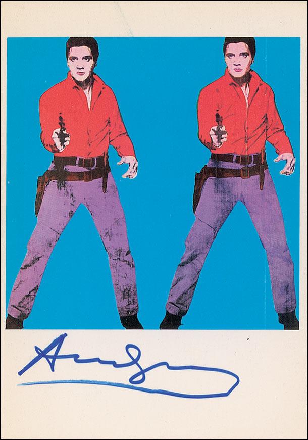 Color 4 x 6 postcard photo of Warhol’s work of gun-toting Elvis, signed in the lower border in blue felt tip. In fine condition.