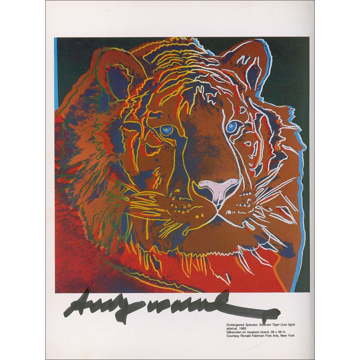 Signed book: Warhol. First edition. NY: Abbeville Press, 1983. Softcover, 8.5 x 11, 128 pages. Signed in black felt tip on an opening page bearing an image of his Endangered Species: Siberian Tiger work. In fine condition, with scattered light wear and surface marks to covers.