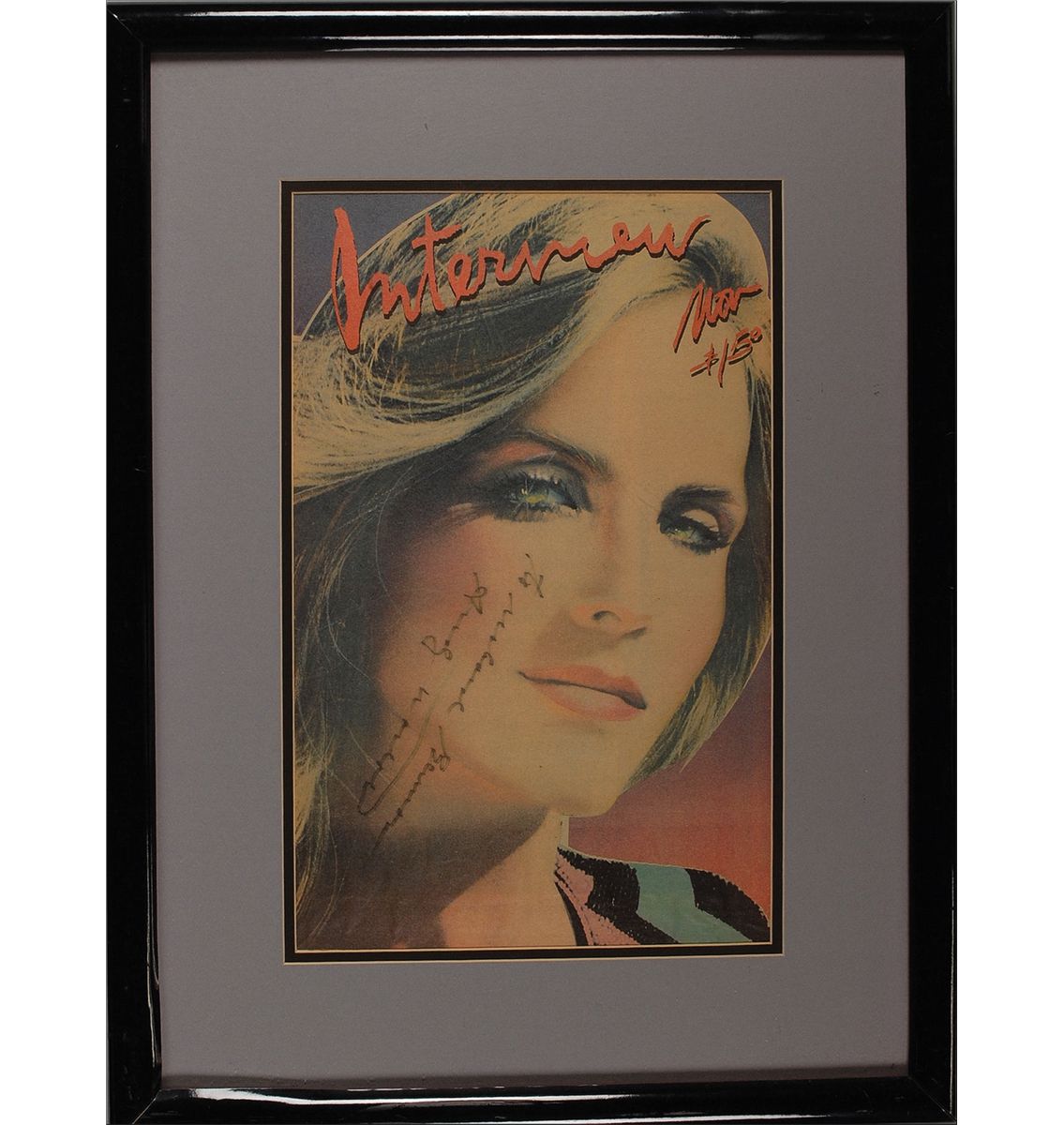 Vibrant retro color Interview magazine cover, 10.5 x 16.5, signed and inscribed, upside-down, in black felt tip by Warhol. Double-matted and framed to an overall size of 19 x 25. In fine condition, with light creasing, and the signature and inscription a bit light, but completely legible. Oversized.