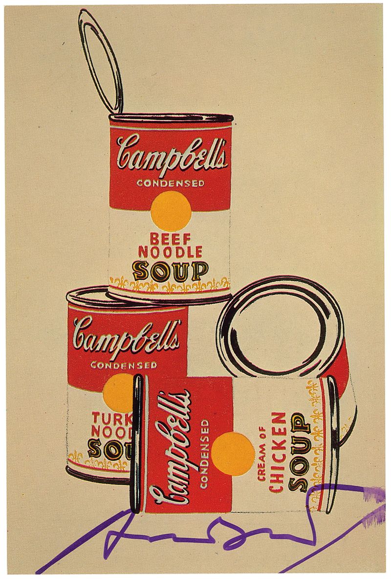 Color 4 x 6 postcard image of Warhol’s 1962 ‘4 Campbell’s Soup Cans,’ signed at the bottom in purple felt tip. In fine condition, with a light brush to end of signature.