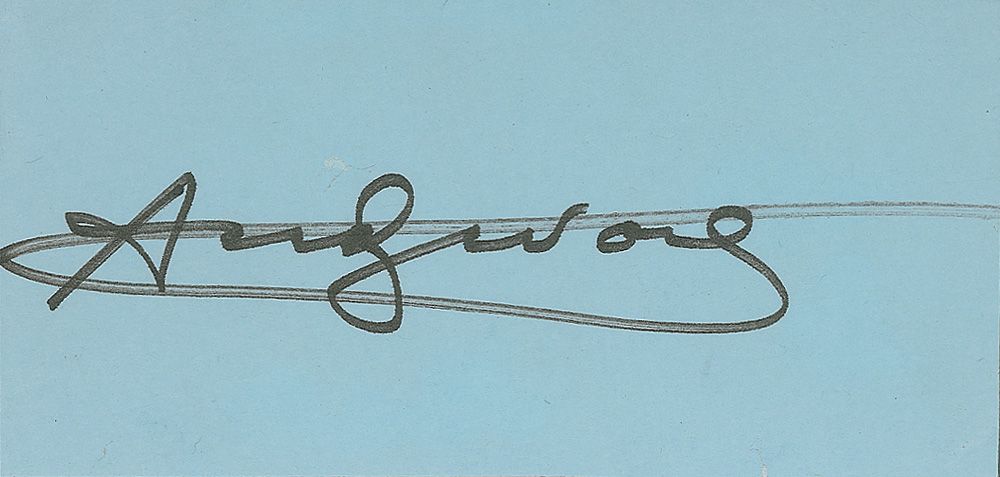 Felt tip signature, “Andy Warhol,” on a light blue 5 x 2.5 card affixed below a 5.5 x 7.5 newspaper photo of the artist. In fine condition.