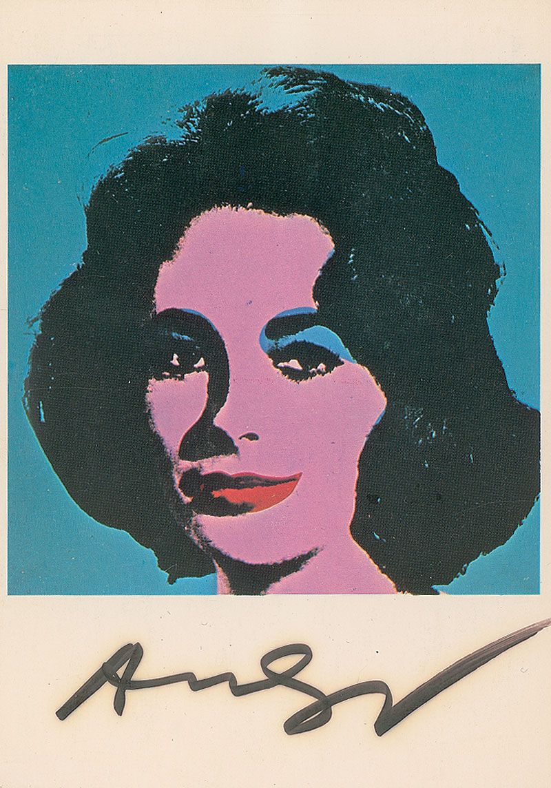 Color 4 x 6 postcard of Warhol’s portrait of Elizabeth Taylor, originally done in 1963, signed in the lower border in black felt tip. In fine condition.