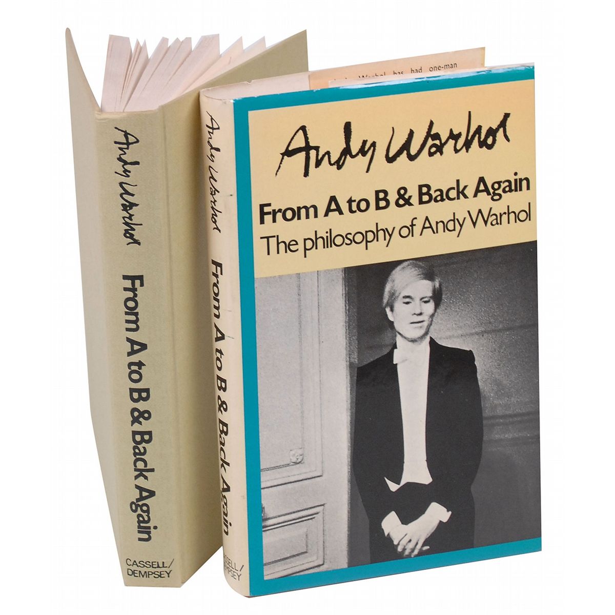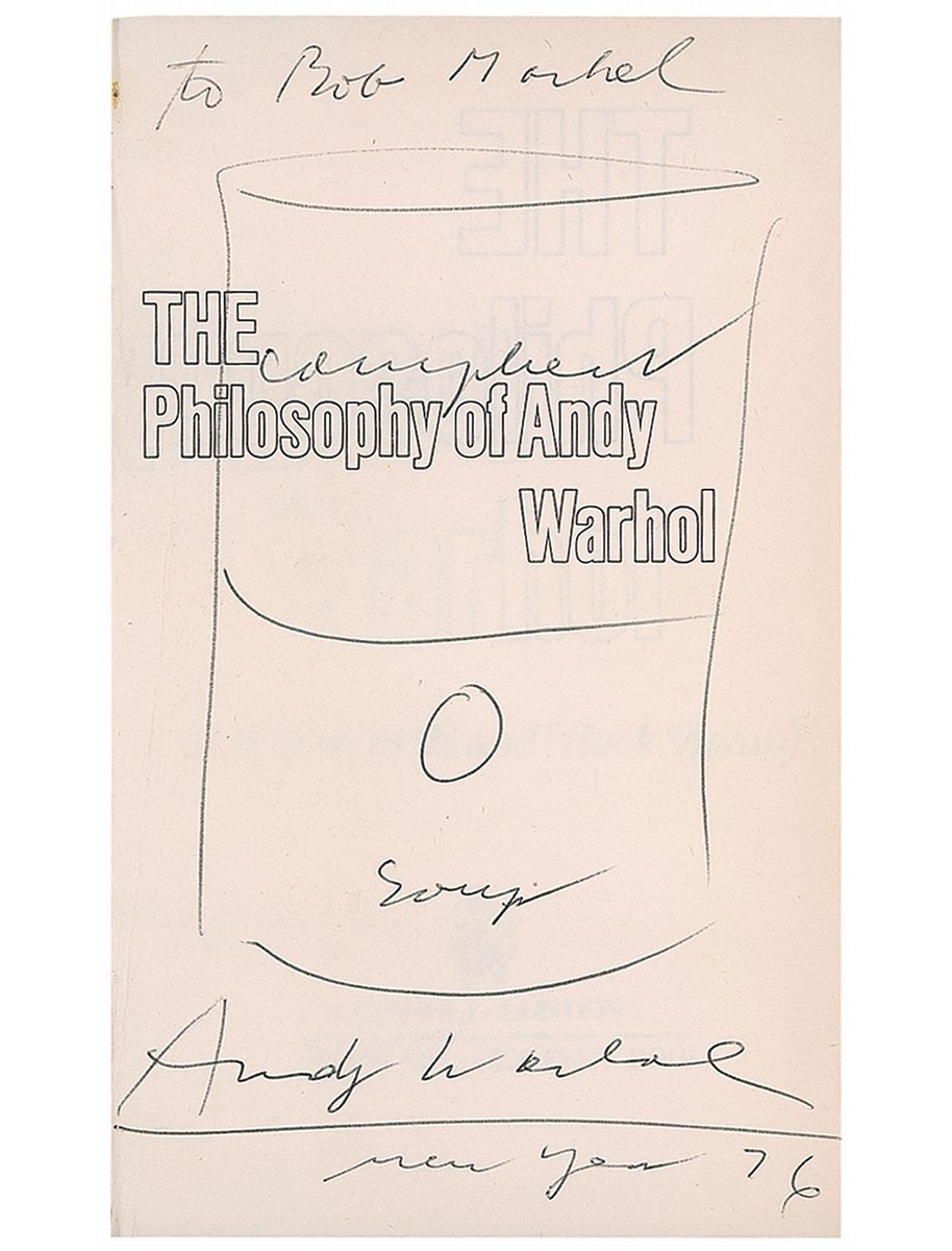 Signed book: From A to B & Back Again. First edition. London: Michael Dempsey, 1975. Hardcover with dust jacket, 5.75 x 9, 241 pages. Signed and inscribed on the half-title page, “To Bob Markel, Andy Warhol, New Year 76,” with the addition of a large sketch of his famous Campbell’s tomato soup can. Autographic condition: fine, with a couple light vertical creases along left edge of signed page, lightly touching first letter of signature. Book condition: VG+/VG+. Olivey-yellow paper-covered boards; minor wear to edges. Dust jacket has minor creases at corners/spine-ends; spine and flaps slightly sunned/yellowed; minor soiling.