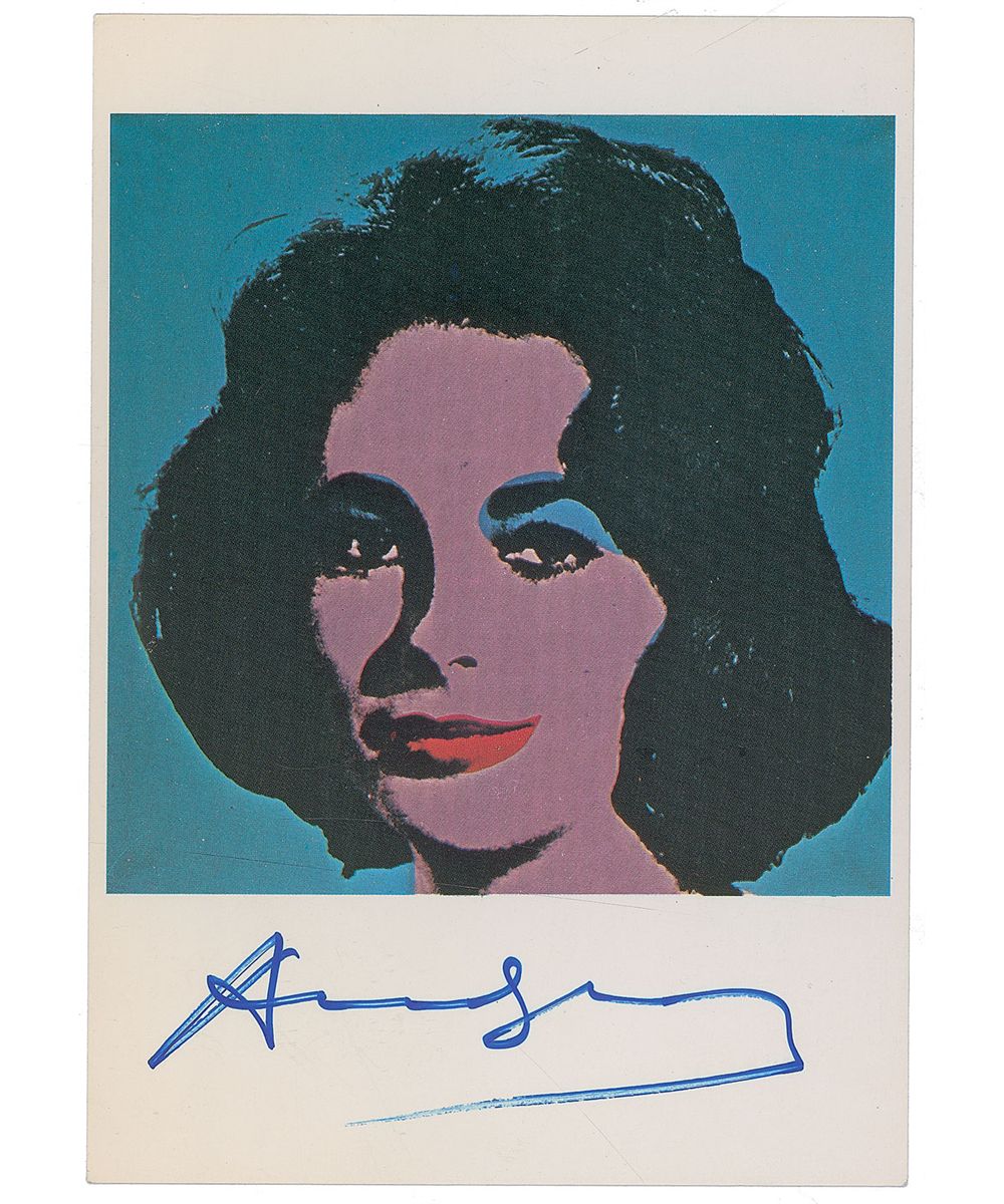 Color postcard of Warhol’s 1963 portrait of Elizabeth Taylor entitled ‘Liz,’ 4 x 5.75, signed in the lower border in blue felt tip. In fine condition.