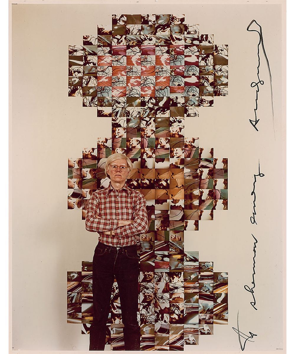 Exceptional color satin-finish 11 x 14 photo of Warhol standing in front of one of his tall photo collages, vertically signed and inscribed in black felt tip, “To Sherman Emery, Andy Warhol.” In fine condition, with a miniscule tear to the top edge. This is just the second photo of this size that we have offered, with this one especially desirable as it depicts him with one of his works—a superb image of one of the most influential artists of the latter half of the 20th century.