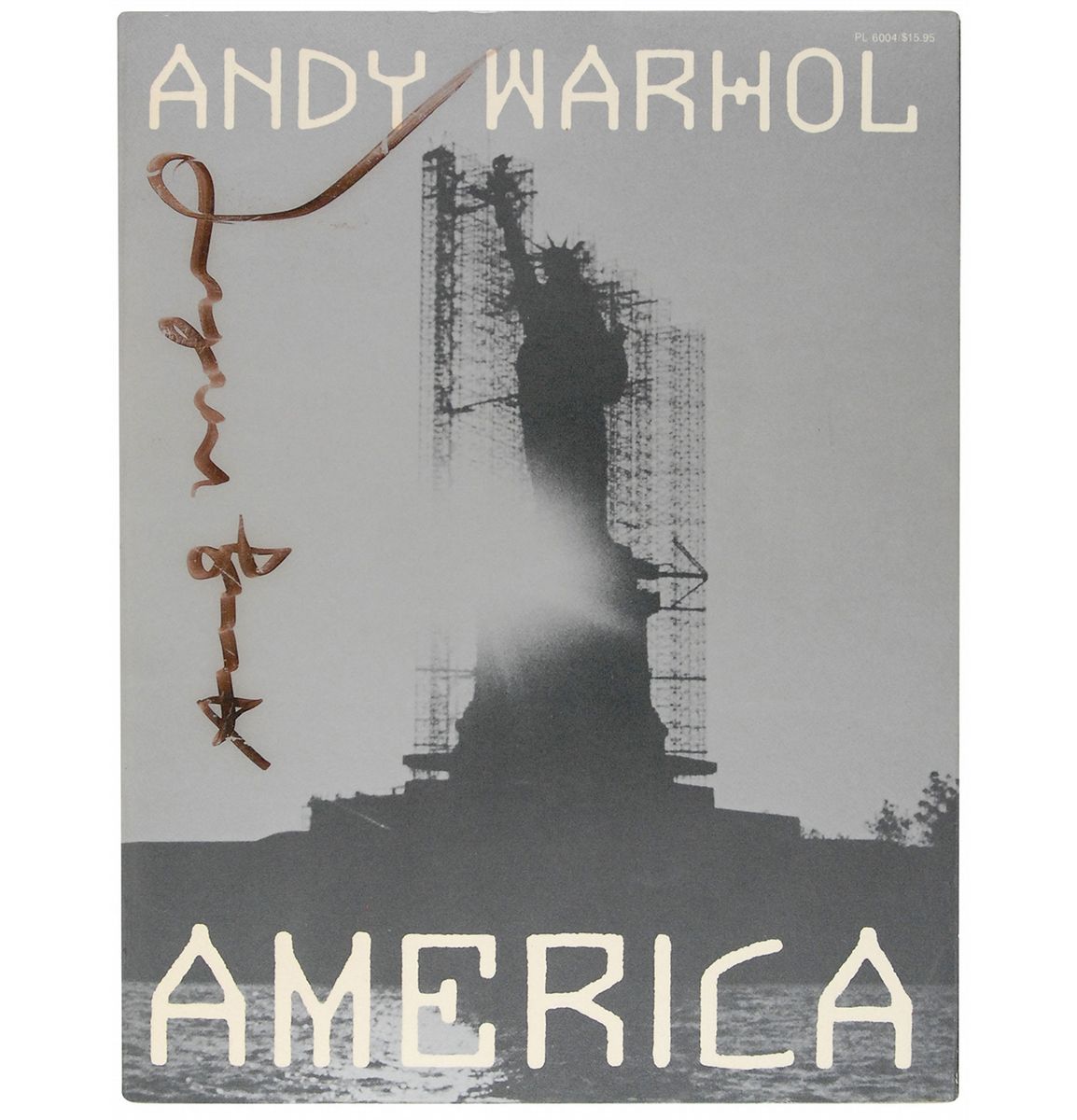 Signed book: America. First edition, first printing. NY: Harper & Row, 1985. Softcover, 8.5 x 11, 223 pages. Signed vertically on the front cover in black felt tip, and signed again on the table of contents. Autographic condition: a few marks to the signature on the cover and haloing to signature inside, otherwise fine condition. Book condition: VG+/None. A highly desirable twice-signed example.