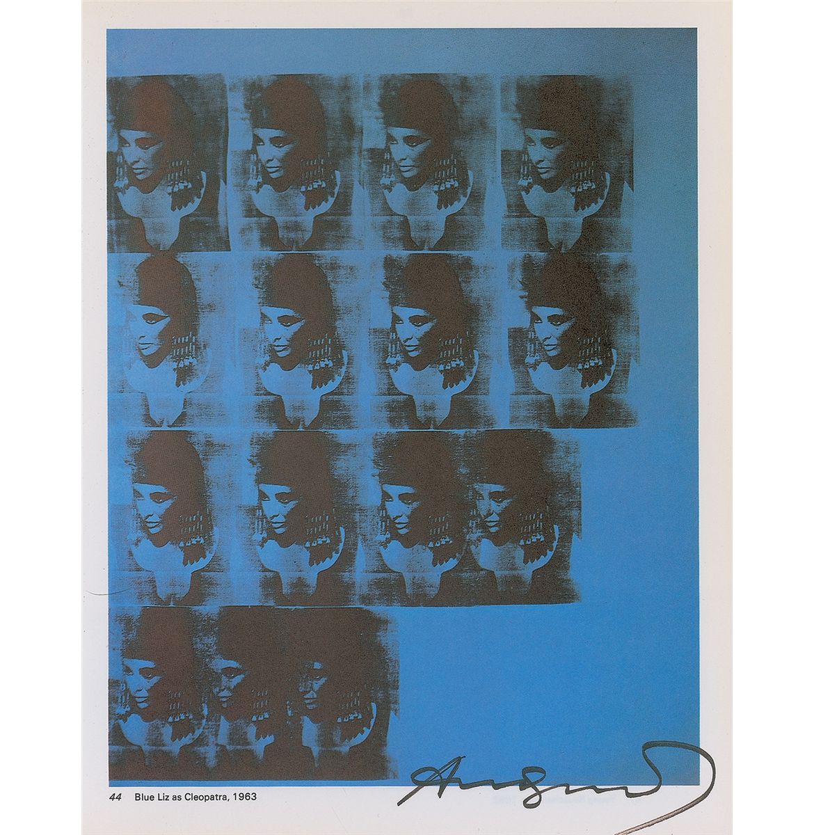 Outstanding exhibition book showing his artwork entitled ‘Blue Liz as Cleopatra, 1963,’ 8 x 10.25, boldly signed in the lower right in black felt tip. Removed from the 1978 German exhibition book entitled ‘Andy Warhol: Ein Buch zur Ausstellung im Kunsthaus Zurich [A Book for the Exhibition at the Kunsthaus Zurich].’ In very fine condition. Consignor notes that this originates from the personal collection of artist Robyn Geddes, who worked for Andy Warhol at The Factory from 1978 to 1983.