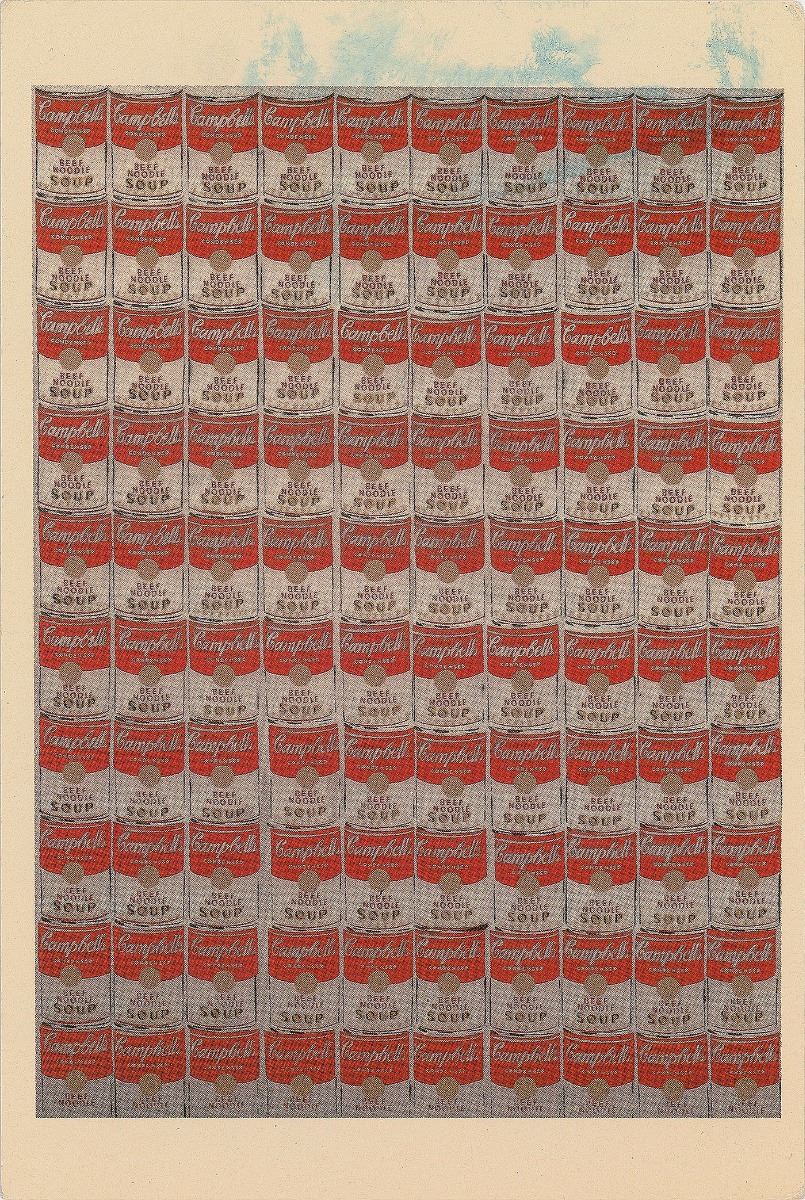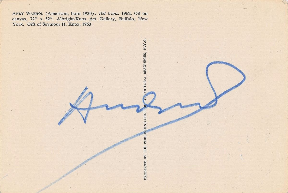 Exceptional color postcard of Warhol’s famous 1962 work ‘100 Cans,’ 4 x 6, signed on the reverse in blue felt tip. Apparently also signed on the front in the upper border, but smudged and faded to an extreme extent. In fine condition.