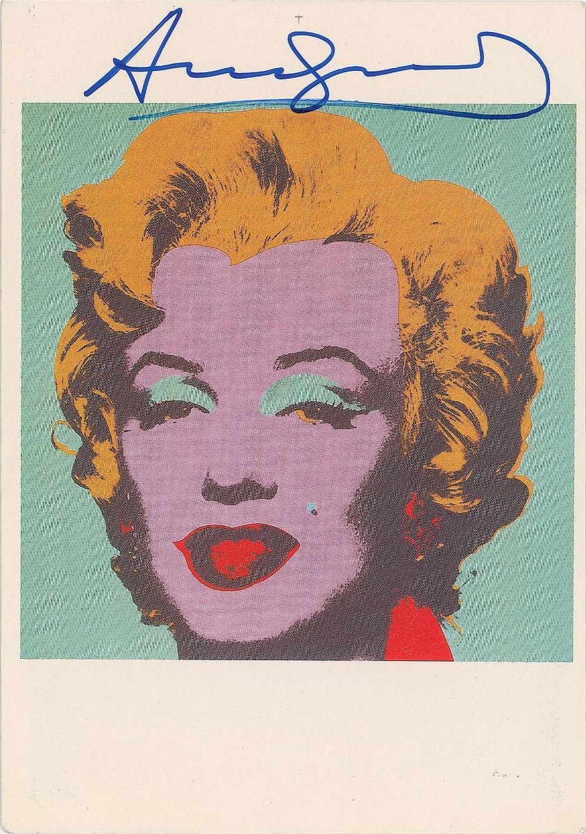 Iconic color postcard depicting one of Warhol’s portraits of Marilyn Monroe, 4.25 x 6, signed in the upper border in blue felt tip. In fine condition.