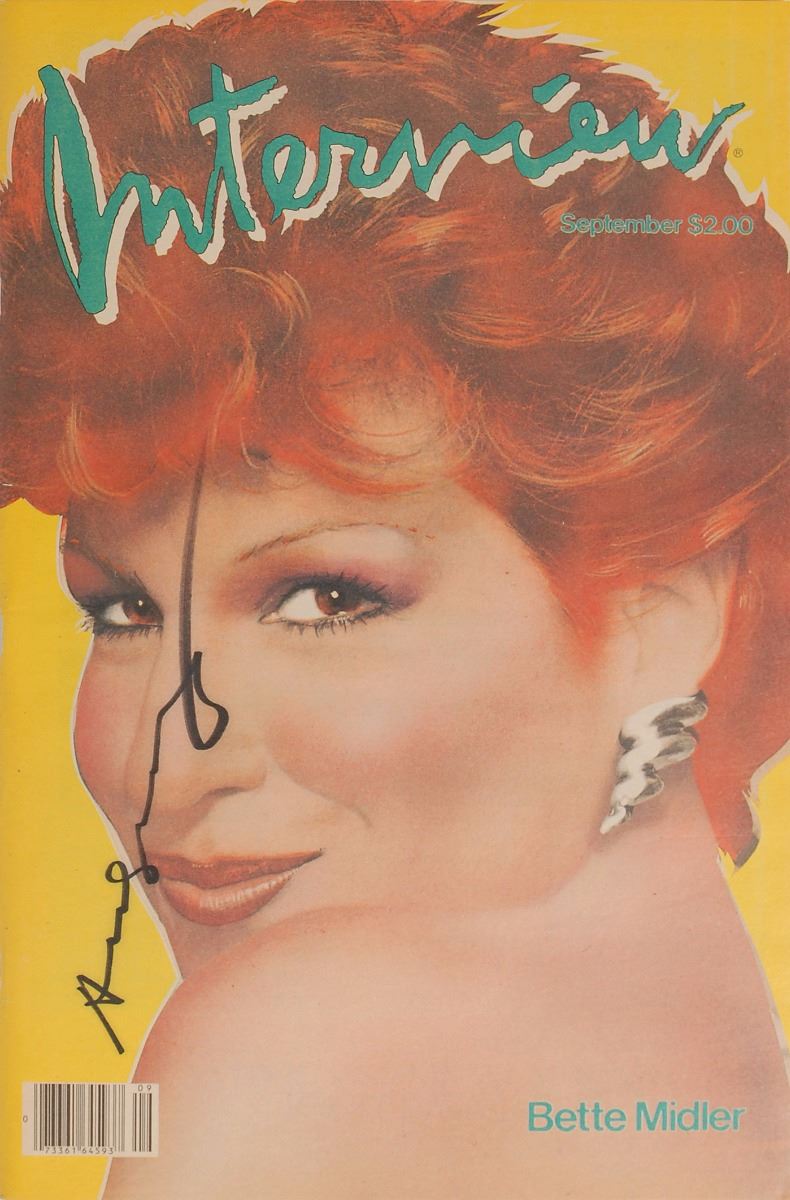 Attractive copy of Interview magazine from September of 1982, featuring a large vivid image of Bette Midler, Vol. XII, No. 9, measuring 11 x 17, 108 pages, signed vertically along the left side of the front cover in black felt tip by Warhol. In fine condition.