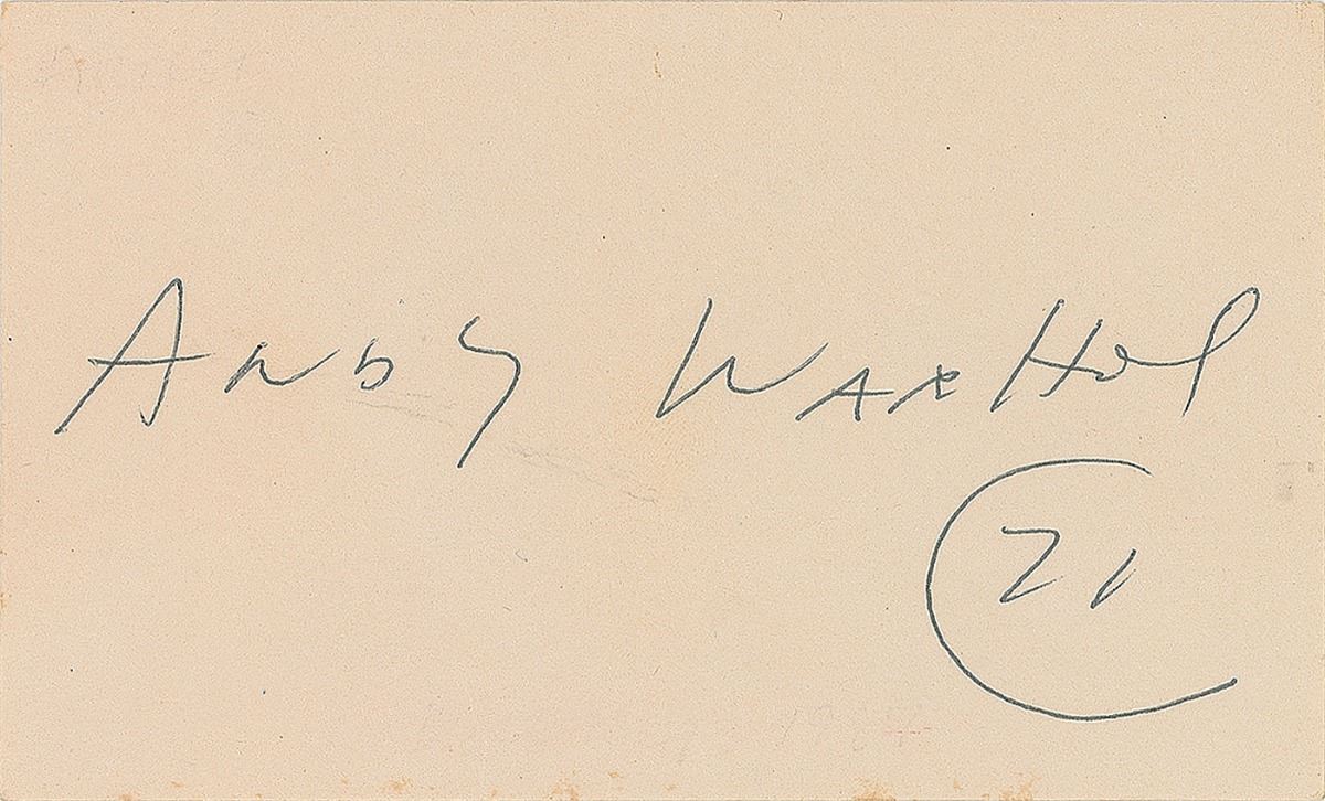 Ballpoint signature, “Andy Warhol, 71,” on an off-white 5 x 3 card. In fine condition.