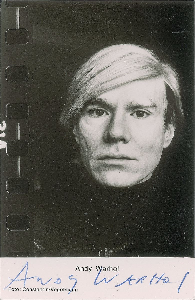 Glossy 3.5 x 5.5 postcard photo of Warhol by Constantin and Vogelmann, nicely signed in the lower border in blue ballpoint. In fine condition.